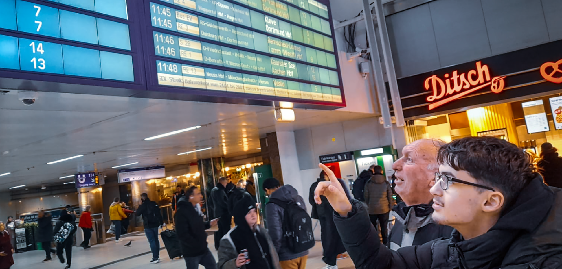 Në hollin e madh të stacionit, Drini ia lexon oraret dhe destinacionet. E shoqëron në njërën prej platformave lart. Në krye të shkallëve, pasagjerët mirëpriten edhe në shqip me “Mirëseardhje”. “A na fotografove me ‘Mirëseardhje’?”, pyet baba, njeriu që nuk mban celular me kamerë. “Ia kallxojmë Hajrizit”, i referohet djalit të tezes së tij, me të cilin kalon pasditet në Jezerc, fshat në Ferizaj.