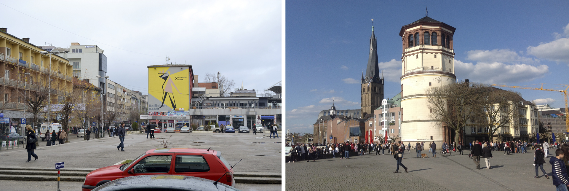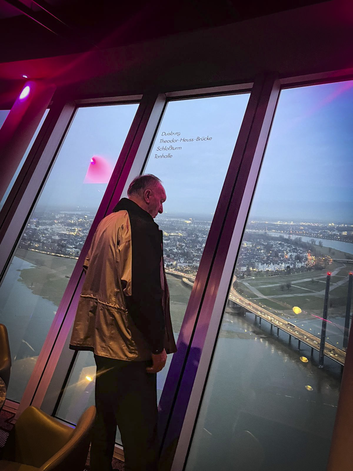 Motra me bashkëshortin na nxjerrin për drekë në një restorant me receta italiane e me pronarë spanjollë. Edhe në njërën prej picerive më të njohura në qytetin e vjetër, Altstadt, pronari është italian, por kuzhinieri shqiptar. Shëtitja përgjatë lumit “RajnaA përfundon te këmbët e “Rheinturm”, pirgu i njohur i Düsseldorf, vepër e arkitektit Herald Delimann përuruar në vitin 1991. Ishte një prej merakeve të babës, por që nuk e kishte vizituar sa ishte në të zezë nga frika se mund t’u binte në sy policëve civilë pasi afër ndodhet edhe selia e parlamentit të landit. Ashensori me shpejtësi prej katër metrash në sekond na ngjet në barin që ndodhet në 168 metra lartësi. Pamja është mahnitëse. Në mot të kthjelltë shihen edhe qytetet përreth, madje edhe Katedralja e Köln.
