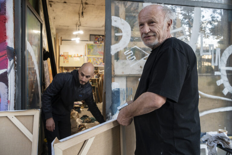 Në të majtë, Hekuran Sokoli, piktor dhe në të djathtë, Agron Mulliqi, piktor, duke ngarkuar piktura brenda ateliesë së tij.