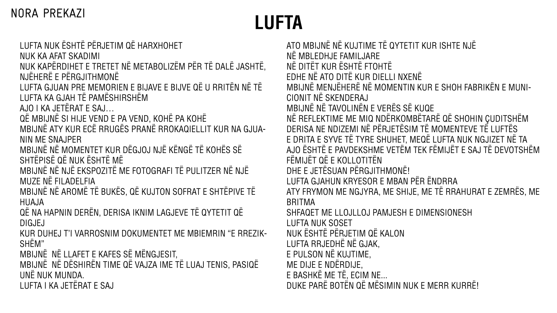 “Gjithmonë ditëlindja më asht lidhë me luftën, jam njoftë edhe nga njerëzt si “çika e luftës”, e sado që jam mundu me i ikë luftës edhe ngjarjeve të lidhuna me ta, lufta m’ka ndjekë në një formë a një tjetër. E rritun me rrëfimet e njerëzve të afërm për përvojat e tyre gjatë luftës, asnjëherë s’e kam pasë të lehtë ta kuptoj në thelb atë. Unë nuk e di ndjenjën me e lanë shtëpinë, kujtimet, njerëzit, jetën e mëparshme mbrapa, rrugës për me shpëtu të gjallë. Këtë përjetim ma kanë përjcellë njerëzit që e kanë përjetu luftën e fundit në Kosovë.
