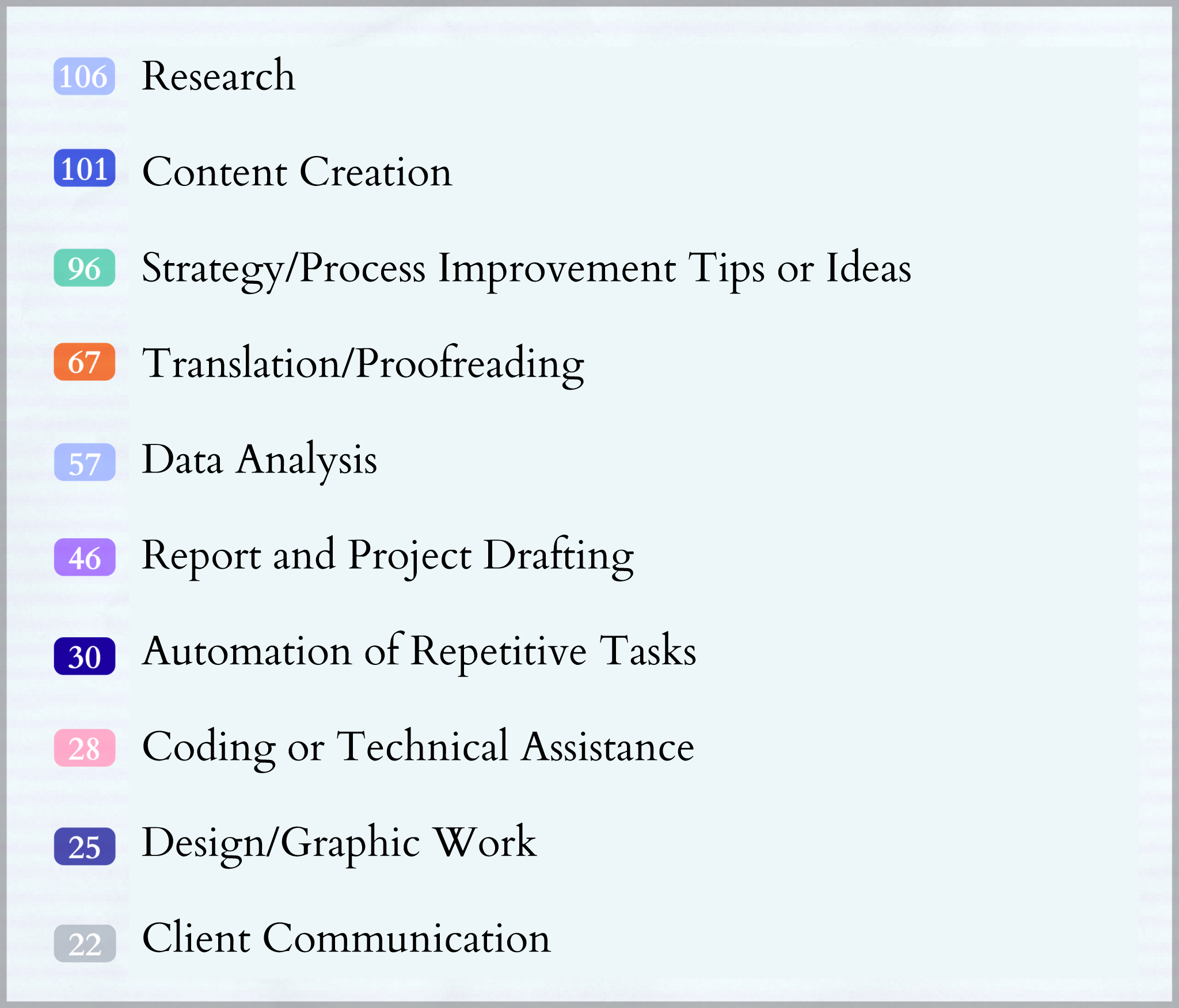 Respondents indicated that they use GenAI most often for research and content creation, such as texts, articles, descriptions and social media posts.