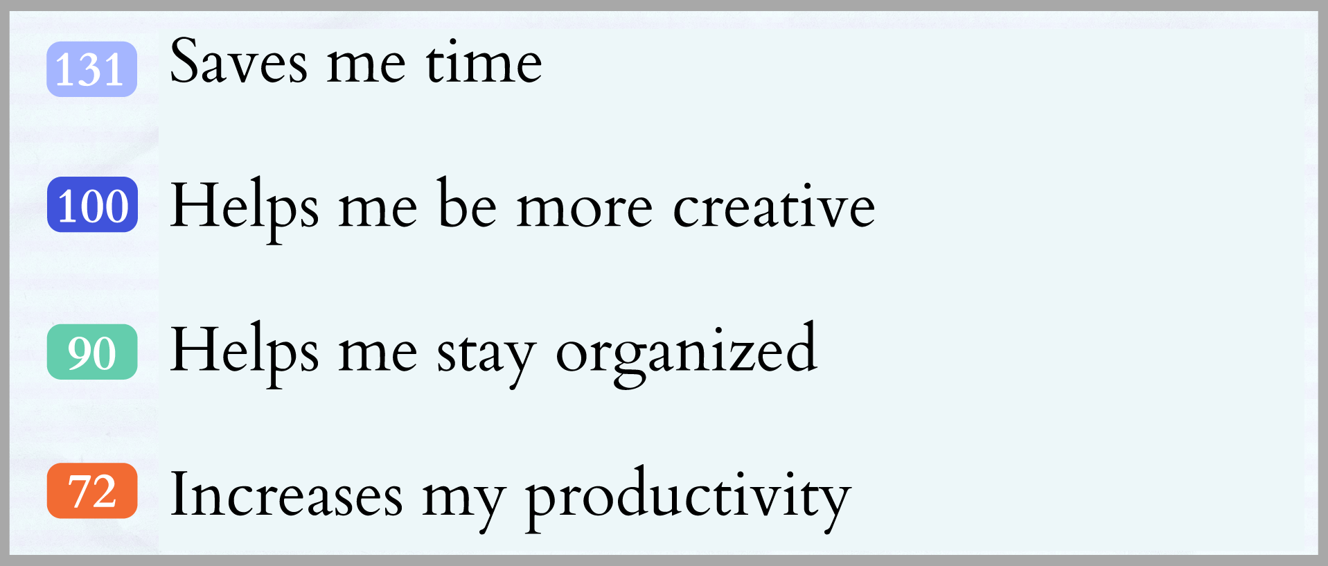 According to respondents, the four main benefits of using GenAI at work are: it saves time, enhances creativity, improves organization and boosts productivity.