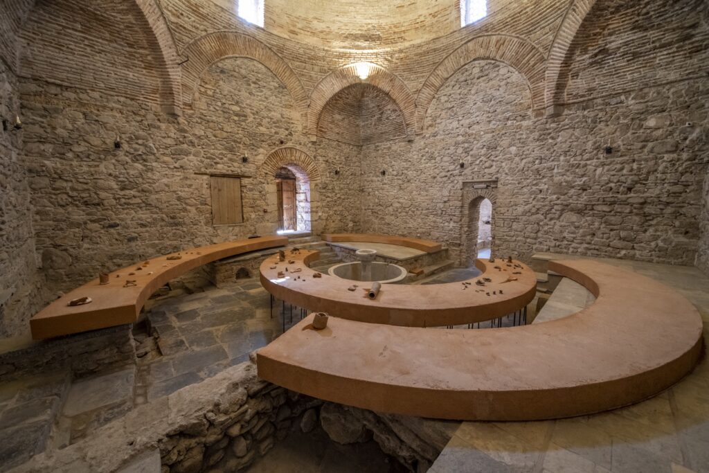 In the vaulted chambers of Prizren’s Hamam, a series of objects by artist Doruntina Kastrati are displayed on cabinets re-imaged as circular slabs. Plastered in a coral kind of pink, the slabs match the patina of the 16th-century building. Cutting across the bathhouse, only a few of the display stands store Kastrati’s artefacts while most sit empty. These objects, fragments of pottery in various sizes – sharp angular shards, the handles and rims of vases – are organised in museum-like arrangements. Among the ceramic remains, Kastrati displays what can only be described as the dredges of the kitchen sink, clumps of hair and skin: bodily waste that often doesn’t make its way into the museum exhibit.