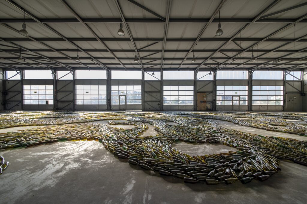 At the Autostrada Hangars, this curatorial logic is announced with “Circulations”by Tamara Gričič, a large-scale installation where over 11,000 bottles are arranged in the form of watery currents, stretching and bending across the bare concrete floors of Hangar 3. Treated by Gričič with care, the industrial waste comes to life, taking the form of a river, one that shines in greens and browns refracted from the glass bottles by way of sunlight. A buoyancy and lightness only aided by the sound of wind, audio whistling from all corners of the vast space.
