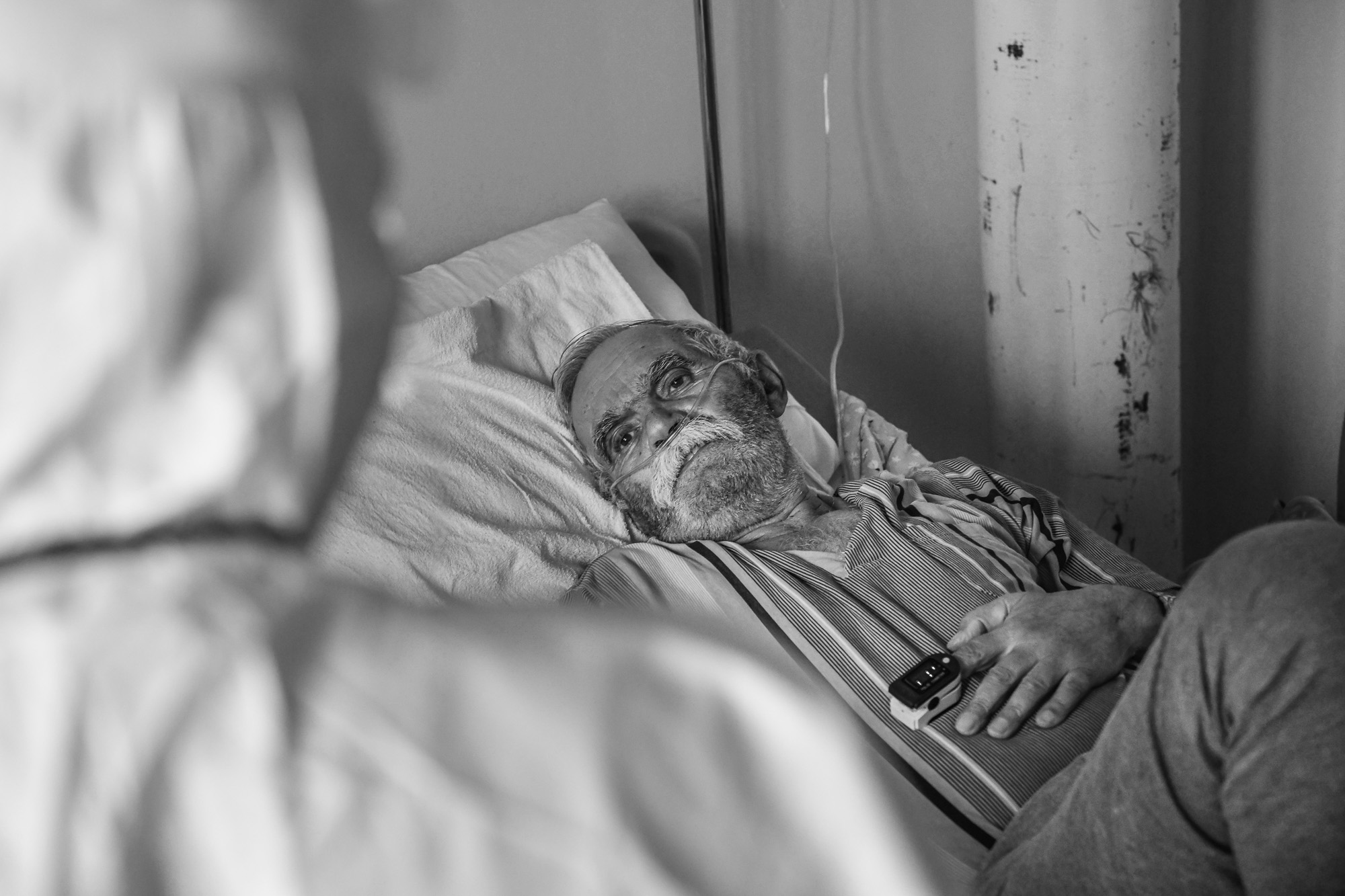 Inside, there are two older guys, who I ask permission to take their portraits. “Go ahead, shoot — we’re survivors,” they laugh. Both are connected to oxygen masks and they’re clearly not in the best of conditions, but their spirits are up, feeling good that at least somebody is looking after them.