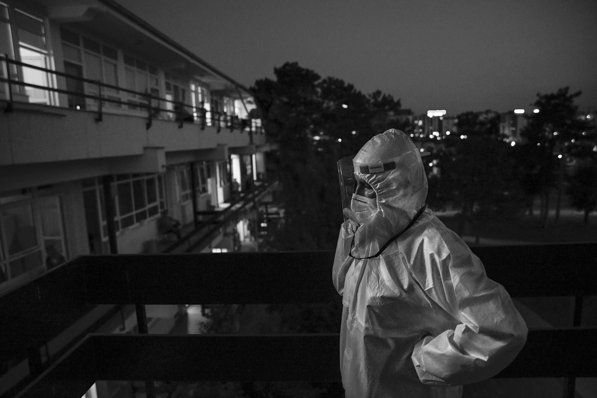 We’re on the first floor of the clinic’s three-floor wards, walking around the balconies that connect the rooms so, as much as possible, we can stay outside where the air flows. I see a lot of family members waiting on the balconies outside the rooms, understandably staying close to their loved ones.