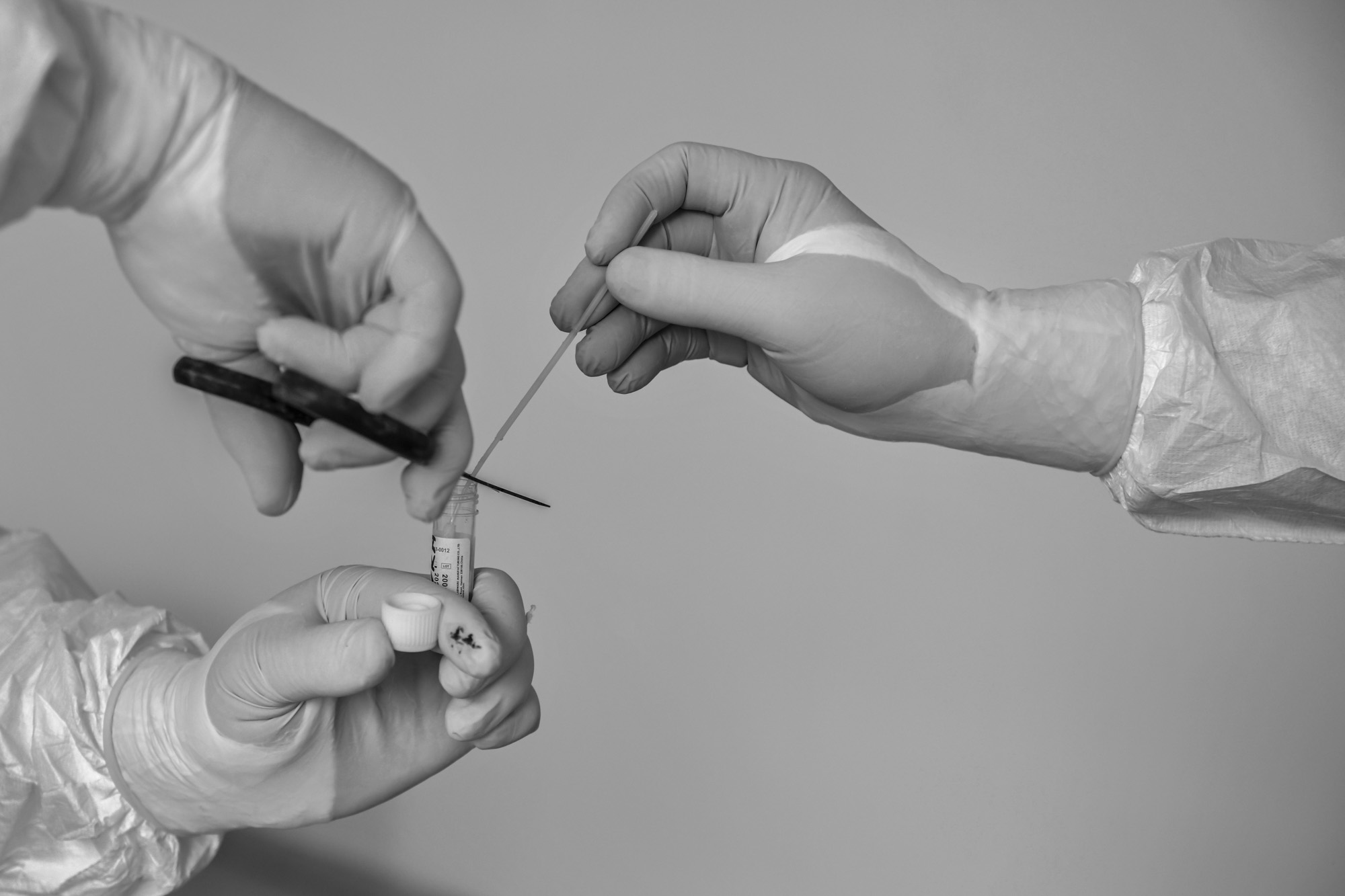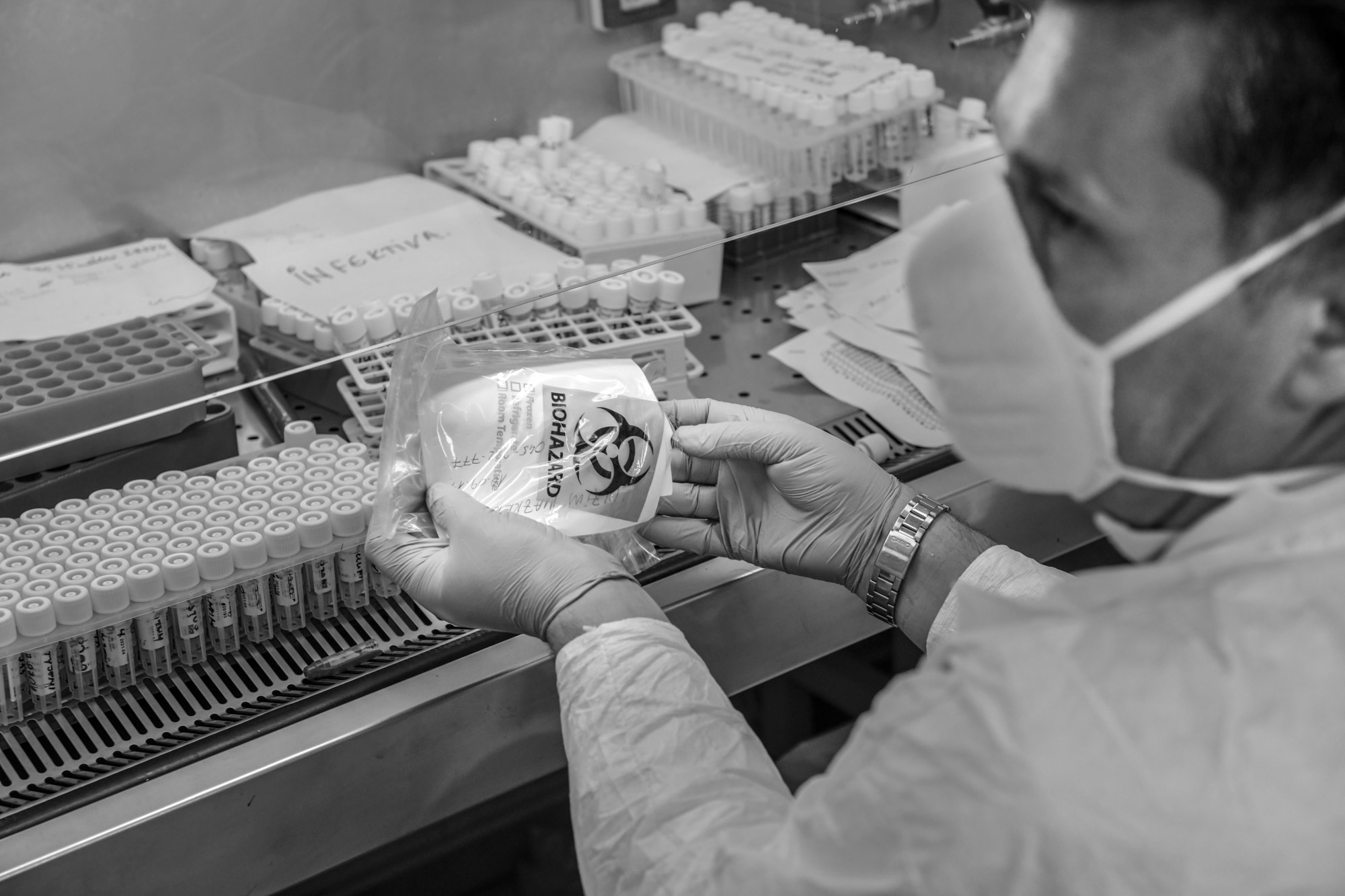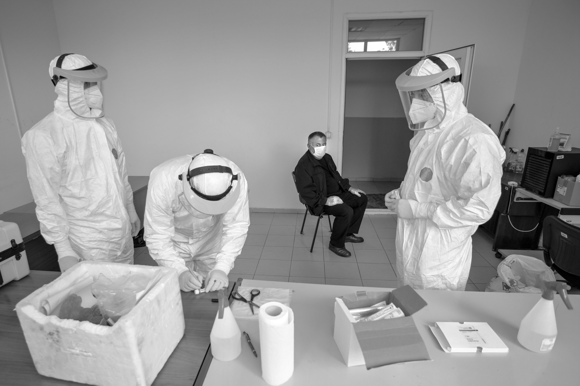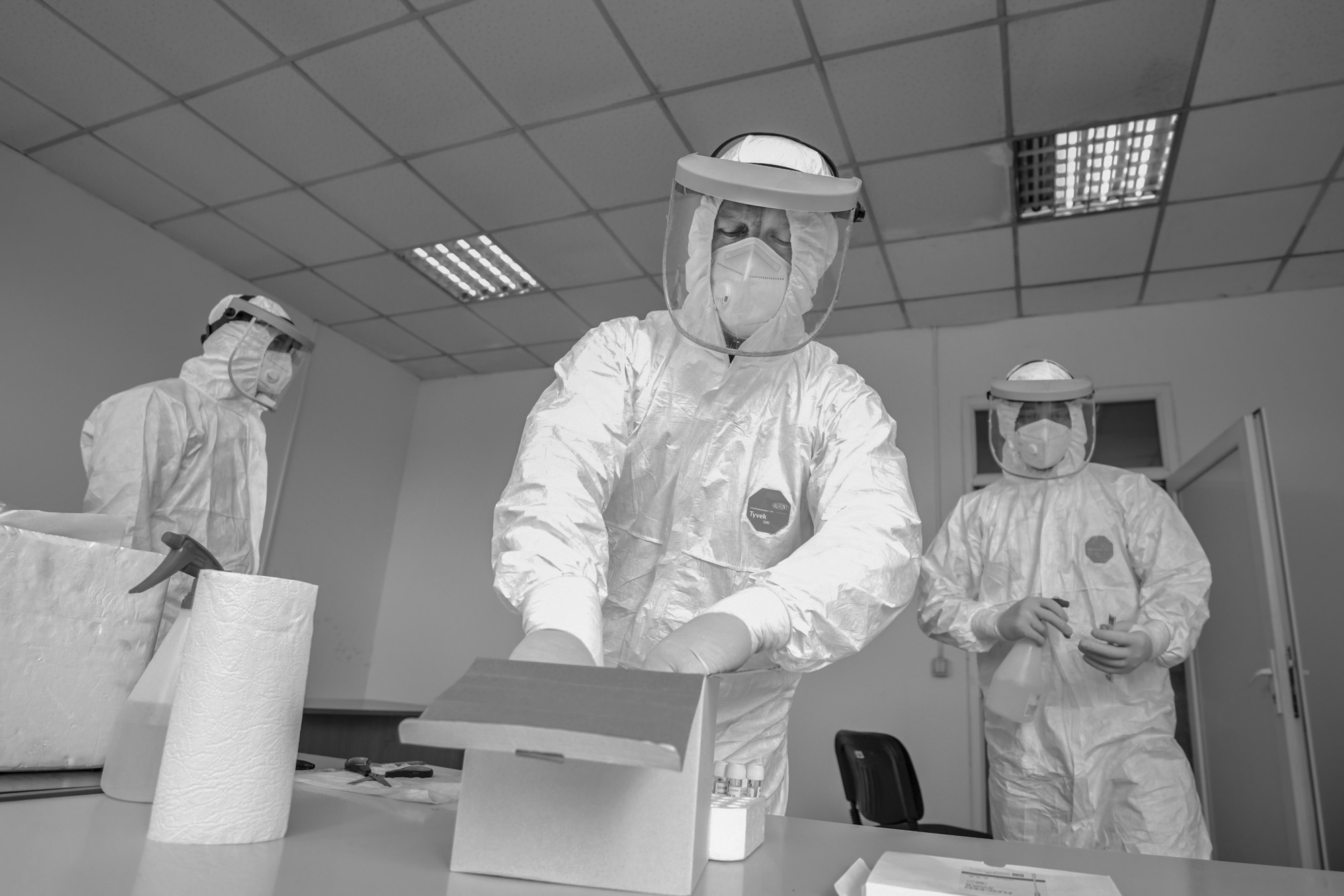 Inside, they again disinfect the hell out of everything, before they get to work conducting their tests.