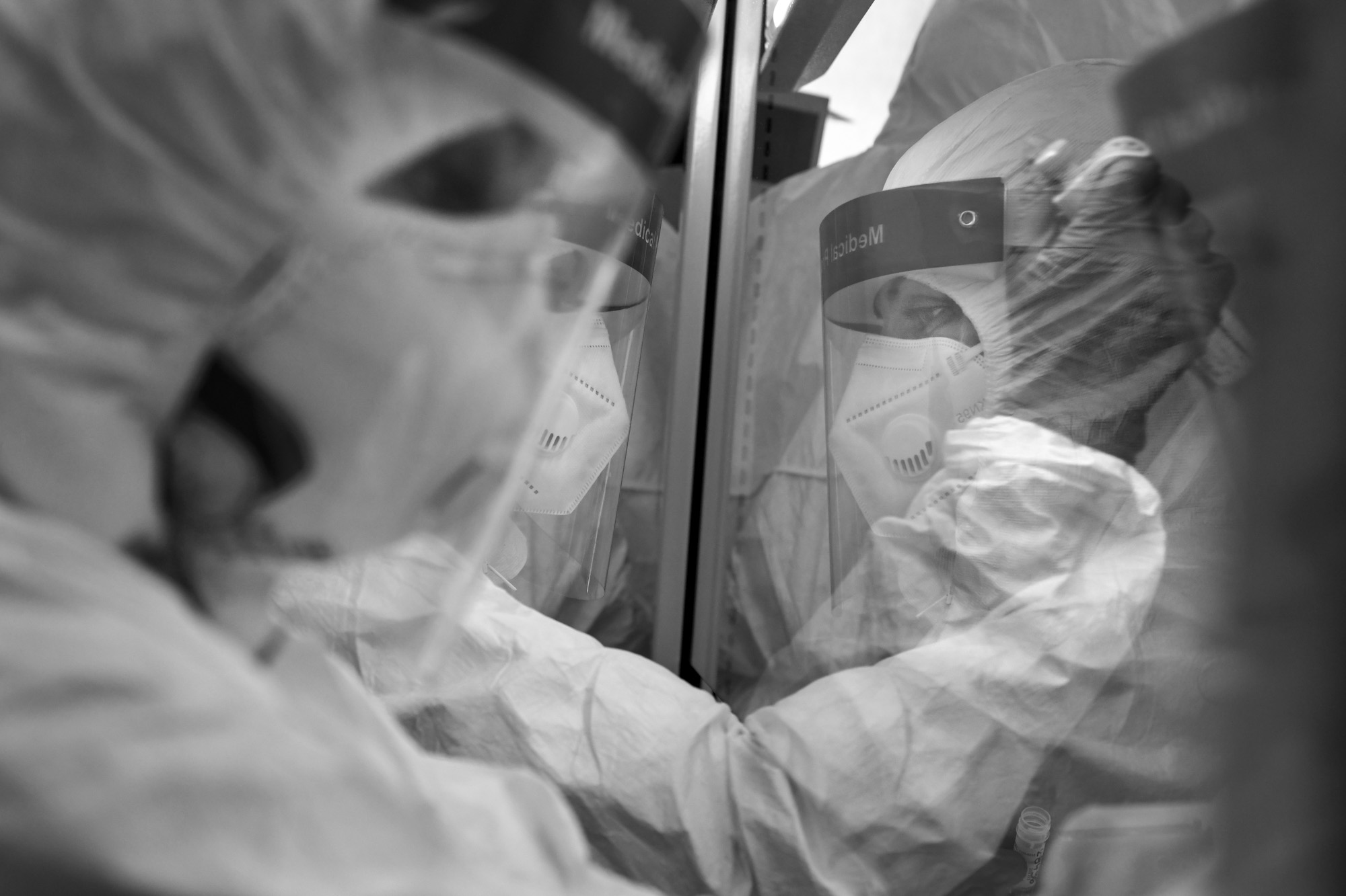 Like the doctors, I’m again in my NASA suit. The doctor takes care to make sure my mask is on properly before we enter the first room.