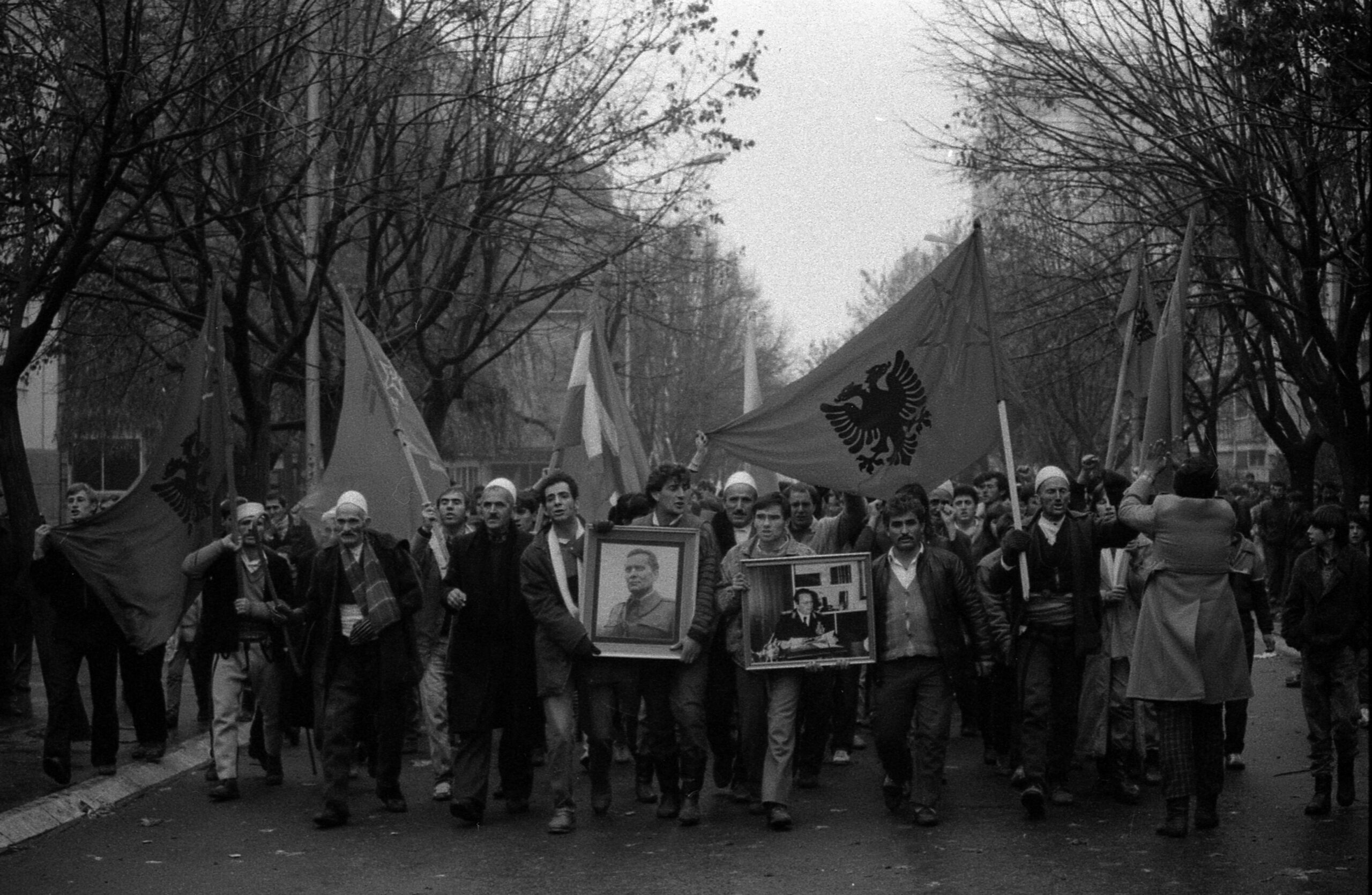 A meeting on this issue was scheduled for the evening of November 17, 1988. Word had reached the miners in Stantërg. On that morning, 3,000 miners left their pits and started marching from Stantërg toward Prishtina, a distance of around 45 kilometers. The front row of the march prominently carried photographs of Yugoslavia’s longtime leader Josip Broz Tito, the Yugoslav flag and the Albanian flag tied together, miners’ flags and flags of other nationalities. From all over Kosovo, other citizen marches headed to Prishtina to join the miners. By evening, around 300,000 people had gathered in Prishtina.