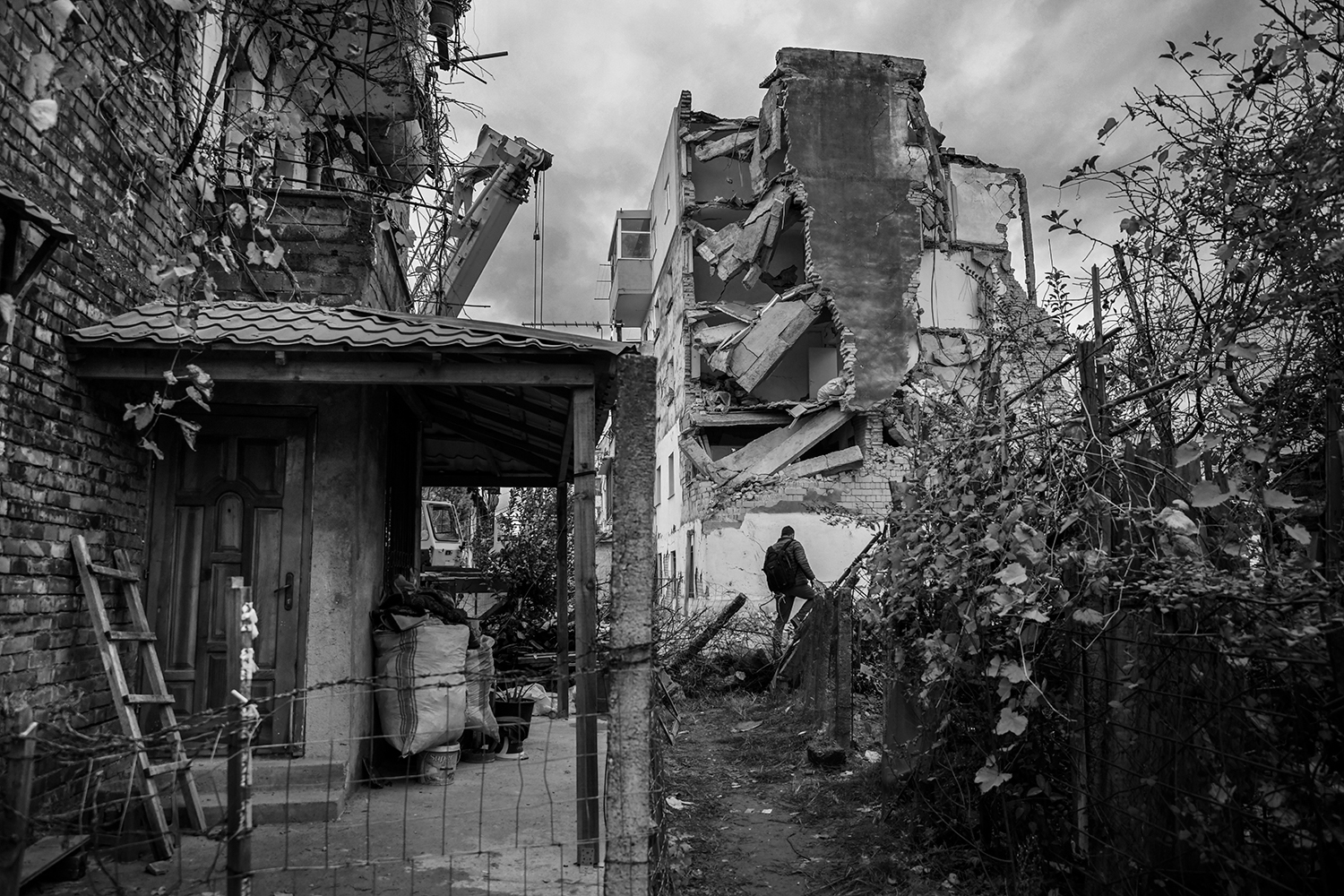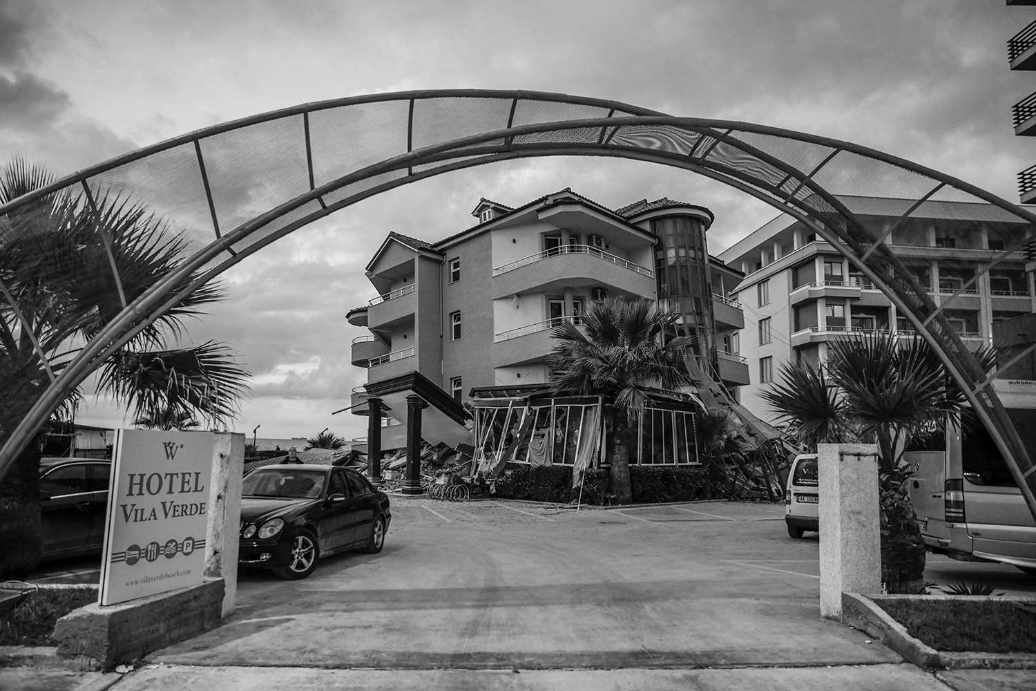 We head for the city of Durrës and get in touch with our fellow photographer friends who are already there, working. While driving to the city, filled with the hotels and cheap tourist sites well known to many Kosovar families from their summer vacations, the city looks largely intact except for the cracks running up buildings, up to the fifth floor. I wonder who would sleep there now.