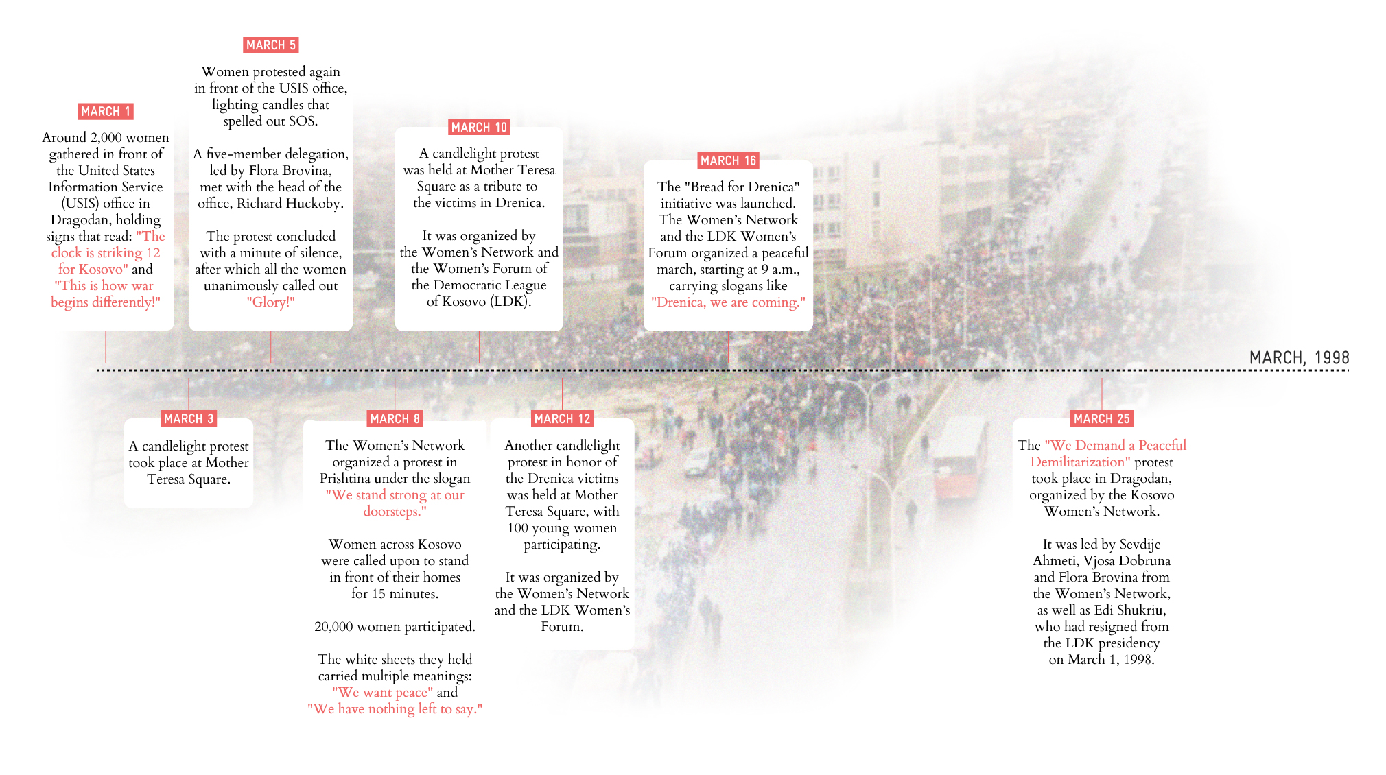 In the spirit of peaceful protests, women activists were also the first to react to the escalation of violence following the massacres of the Ahmeti and Jashari families in February and March 1998. The protection of families, women and children, as well as public mobilization in their support, reconciled the different approaches taken by women in the LDK Forum and women in civil society. Women united under the name Kosovo Women’s Network and began their public engagement together. March 1998 became the month when the women’s movement became more visible and active in public through protests.