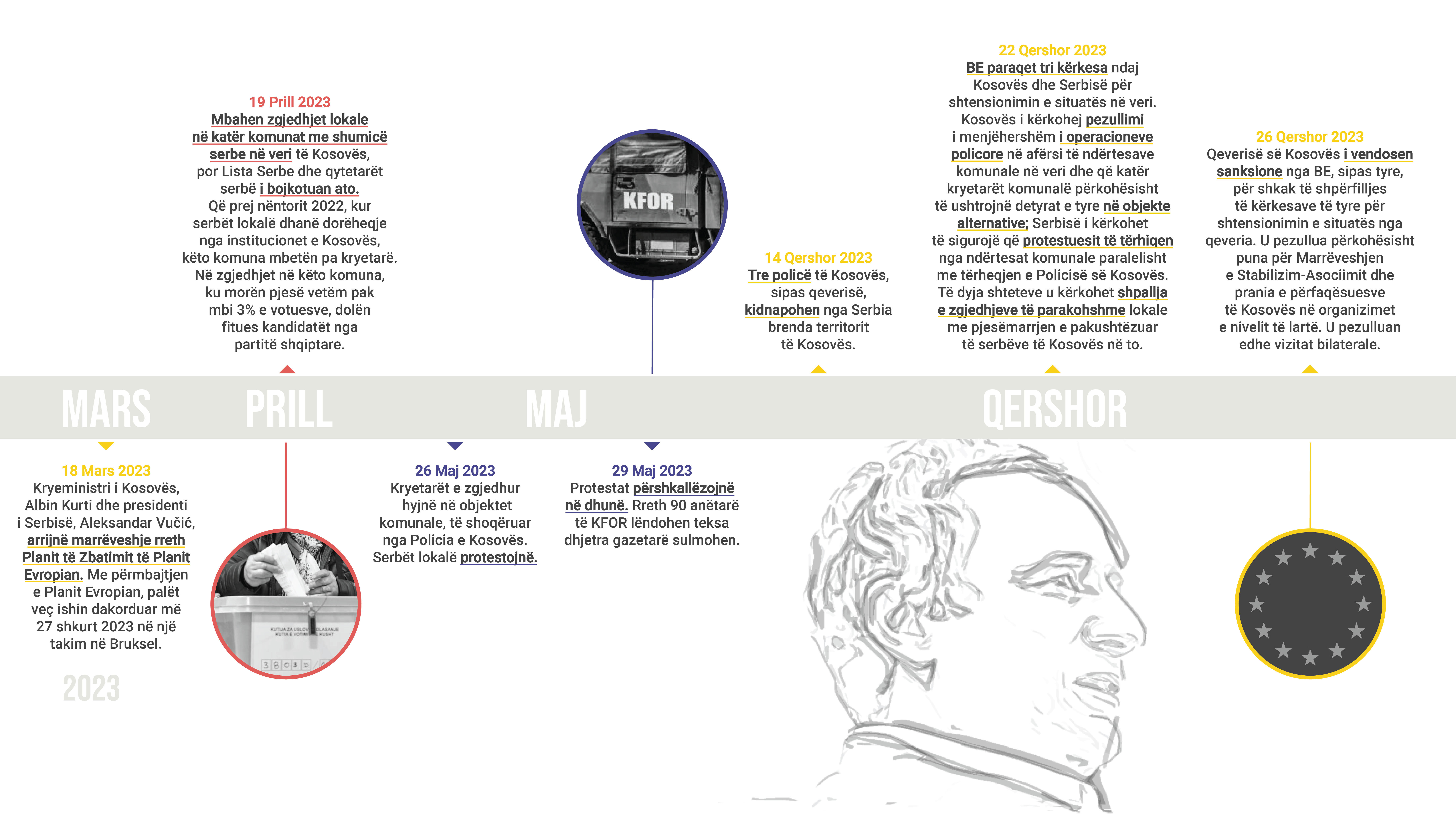 Në maj të vitit 2023, në komunat me shumicë serbe shpërthyen protesta, të cilat u nxitën kur kryetarët jo serbë, që kishin fituar mandatin në zgjedhjet e jashtëzakonshme lokale ato komuna, nën përcjelljen e Policisë së Kosovës, hynë në objektet komunale. Këto zgjedhje u bojkotuan nga votuesit serbë dhe partia më e madhe serbe në Kosovë, Lista Serbe, nuk mori pjesë. Lista Serbe i udhëhoqi këto protesta duke i quajtur kryetarët jolegjitimë.