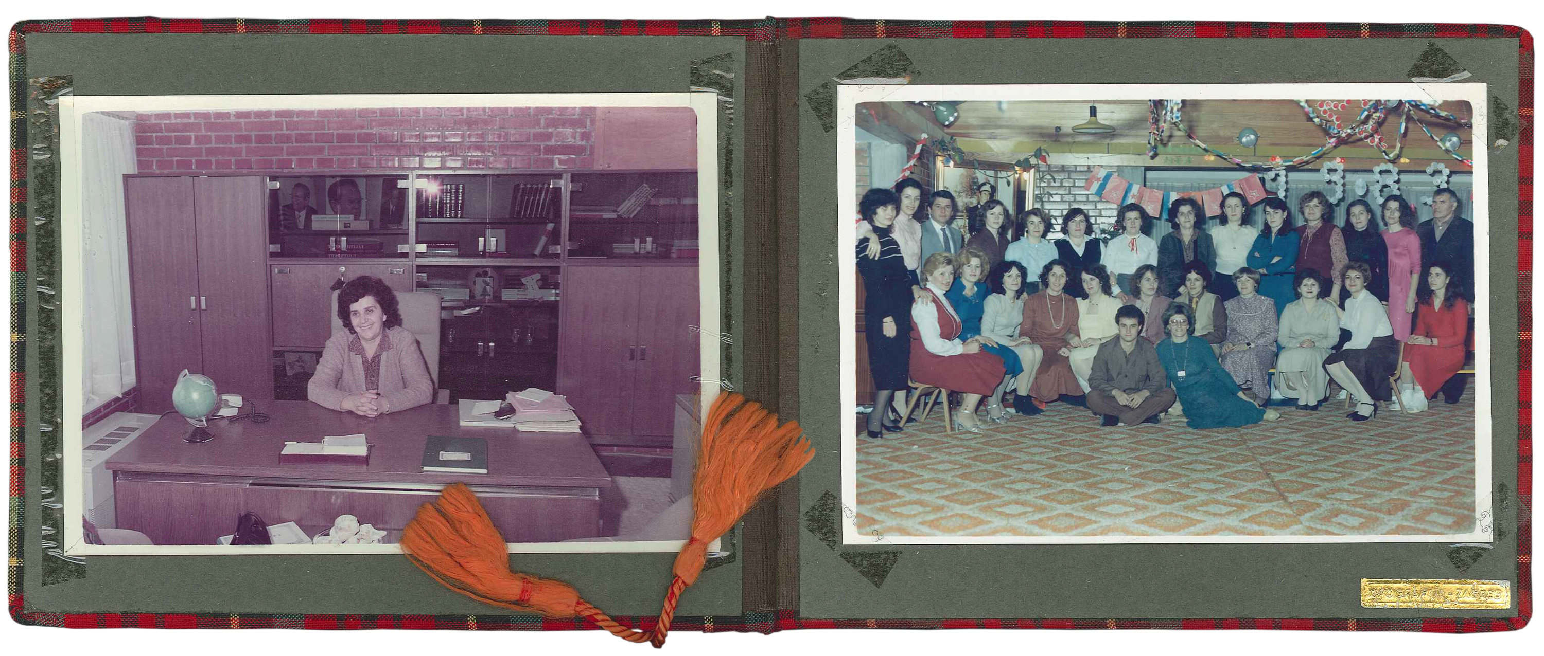 Myrvetja në zyrën e saj si drejtoreshë e objekteve parashkollore të Prishtinës, mesi i viteve 1980, dhe me stafin e saj në kopshtin e fëmijëve në Ulpianë në festat e fundvitit në vitin 1982.