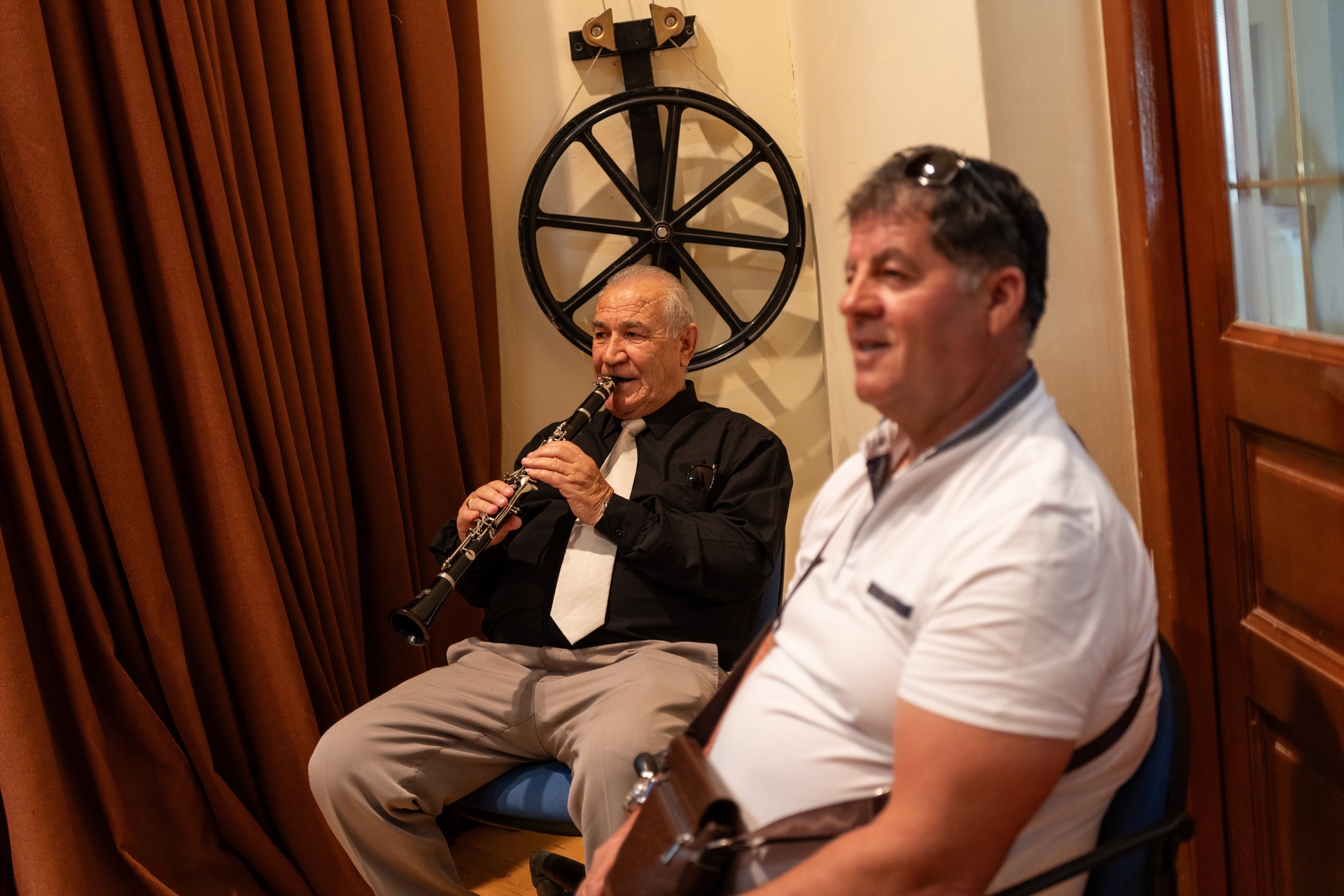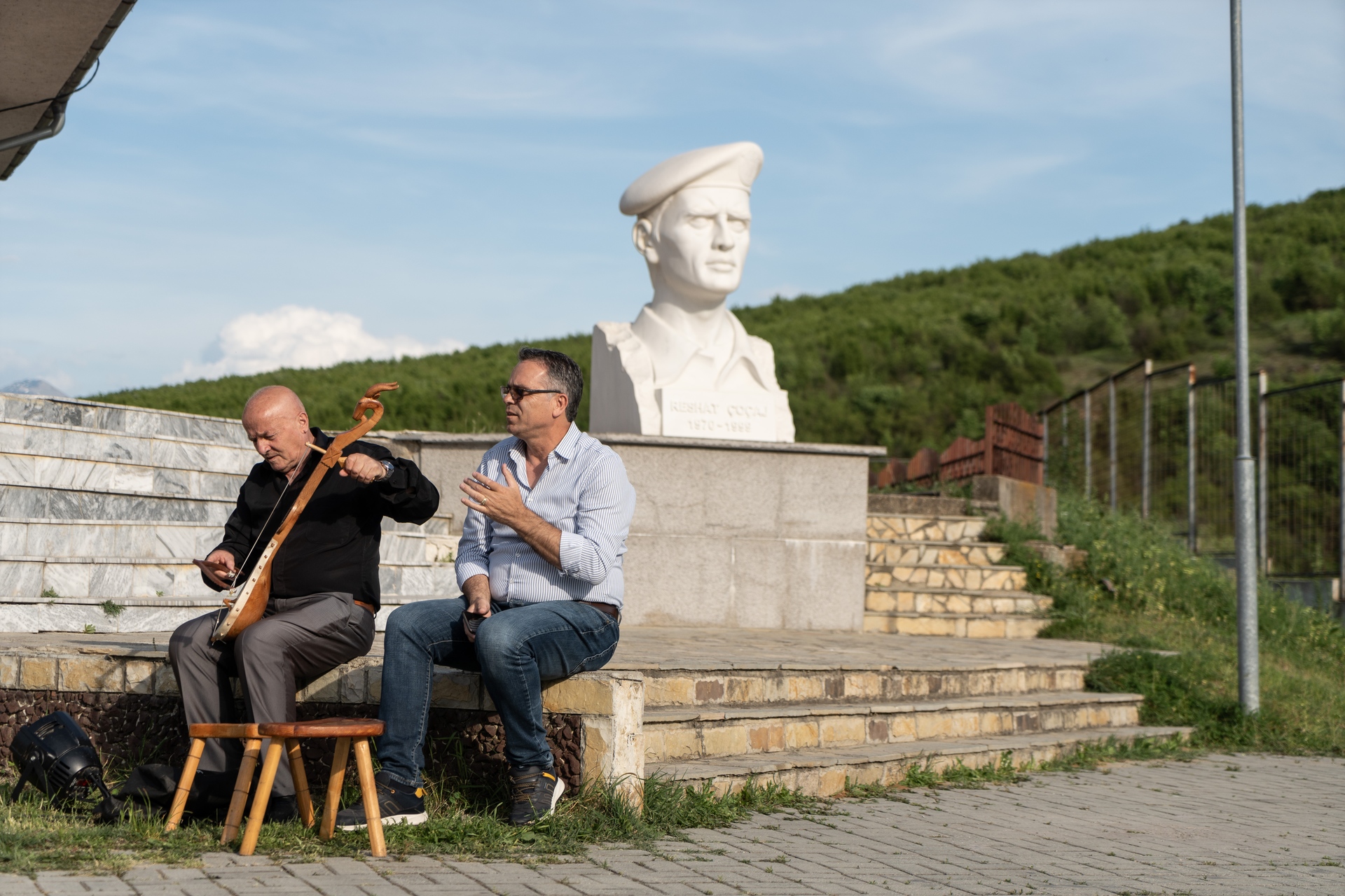 Në ditën tjetër, një dyshe që performon në tingull e fjalë po bëhej gati për skenë. Nazmi Hajdari e Muzafer Osmani, të dy nga Ferizaji, ishin ulur krah për krah. Nazmiu kishte kapur në dorë lahutën dhe po e lëvizte një distancues të telit të lahutës për të gjetur “dyzenin”, tingullin ideal.