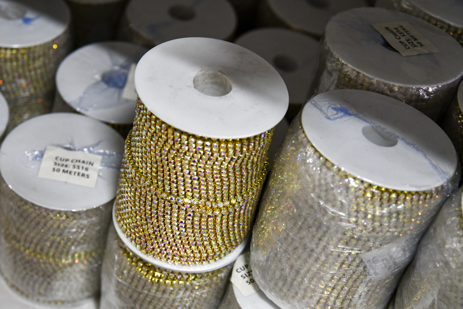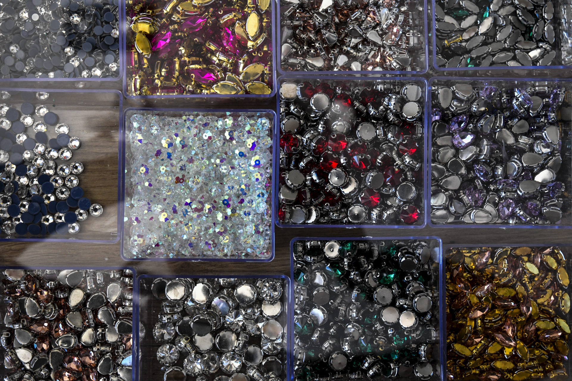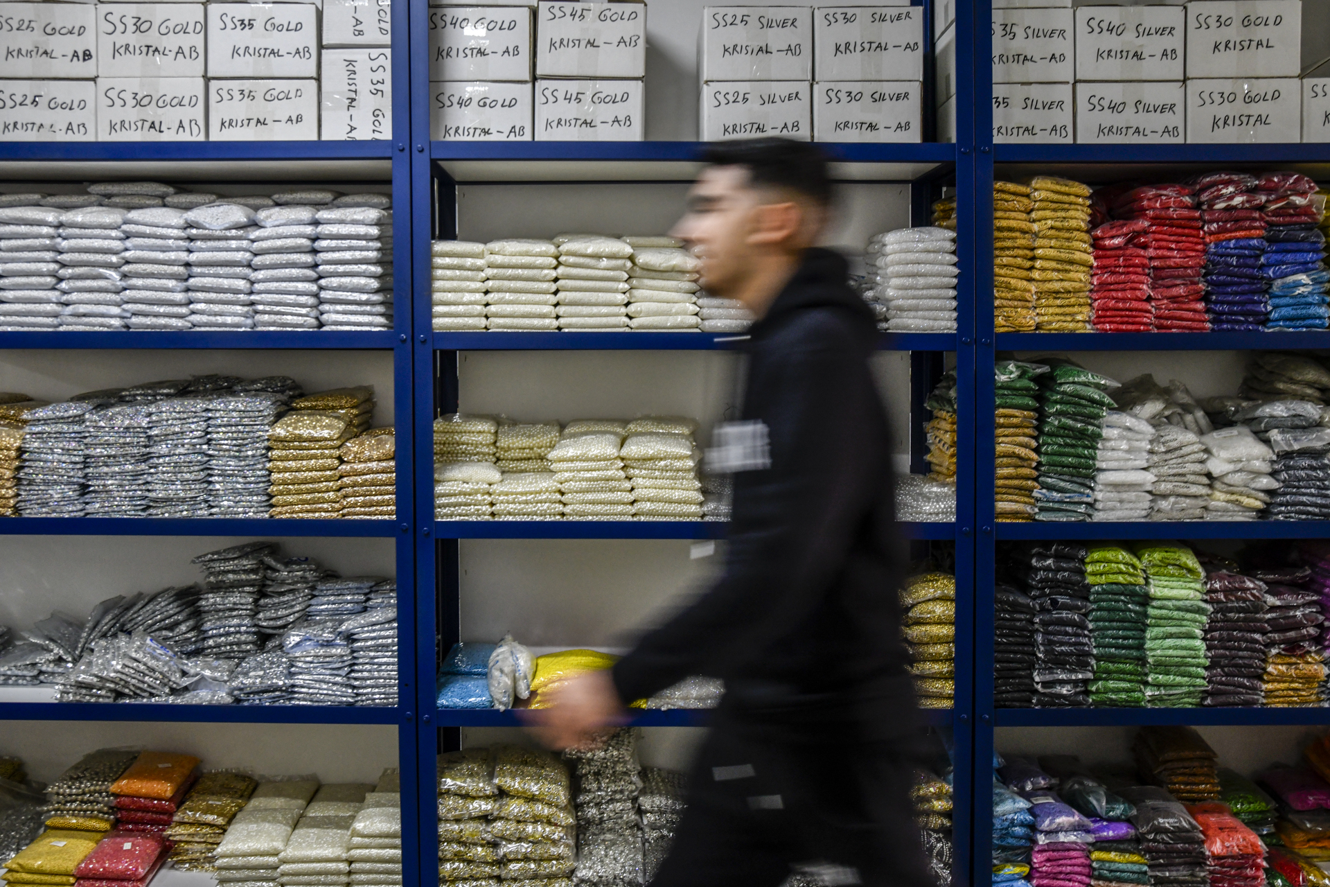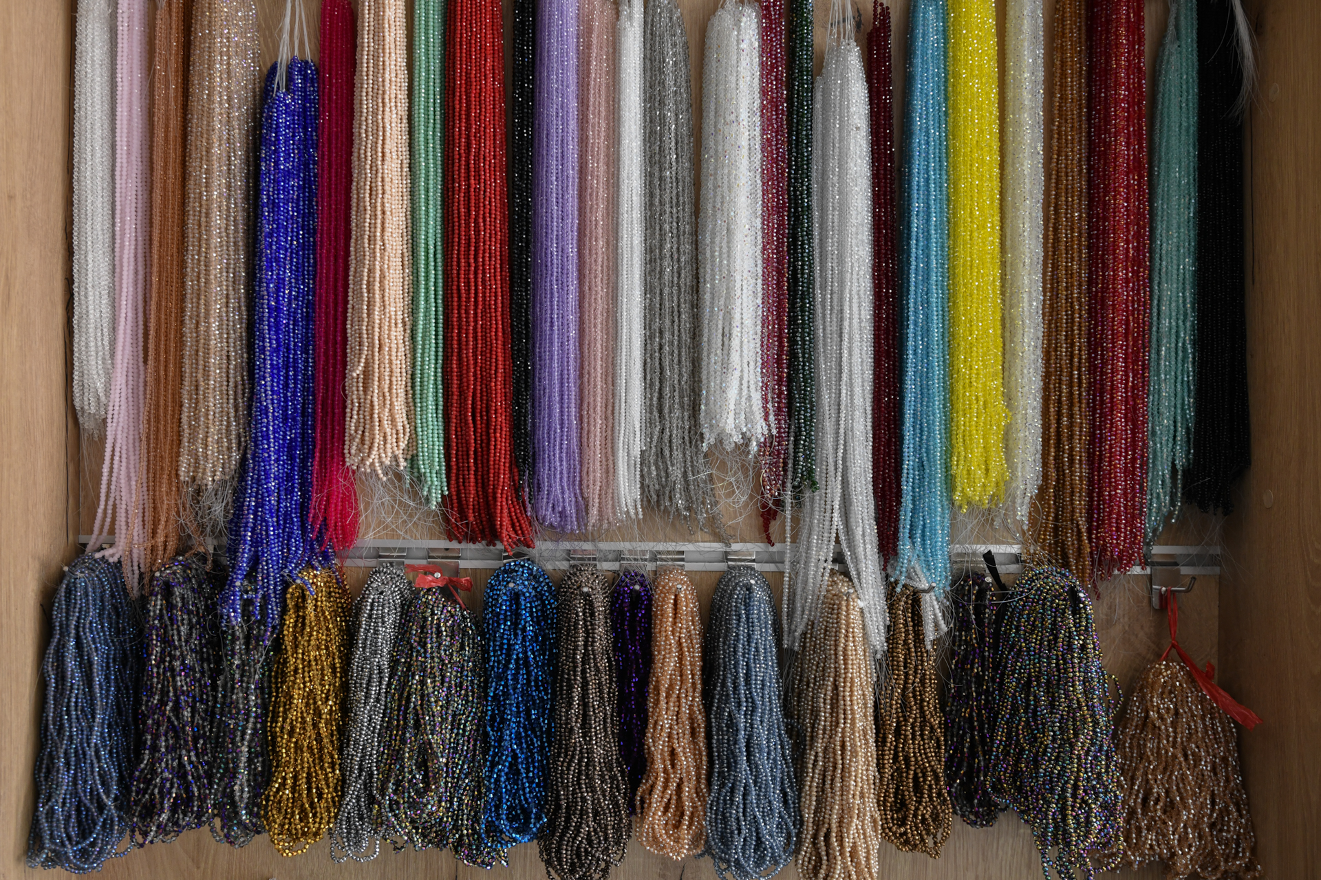 Pasqyrat në dyqan dyfishojnë shkëlqimin e rruazave, disa prej të cilave vijnë si lëndë e parë dhe më pas përpunohen nga Erkani.