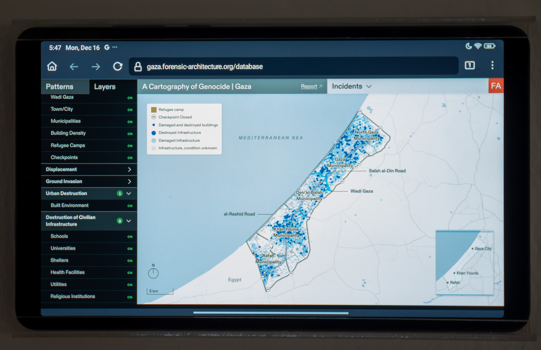 Me Arkitekturën Forenzike, grup ndërdisiplinor kërkimor dhe njëri nga kontribuuesit në ekspozitë, u njoha kur e publikuan një investigim novator së bashku me Amnesty International për burgun Saydnaya në Siri. Arkitektura Forenzike përdor metodologji arkitekturore dhe digjitale për t’i investiguar shkeljet e të drejtave të njeriut dhe dhunën shtetërore, duke zbuluar të vërteta që shpesh fshihen nga strukturat e pushtetit. Në një rastësi të jashtëzakonshme, pas hapjes së ekspozitës në Shkup, të burgosurit/et e Saydnaya u liruan pas rënies së regjimit të Asadit.