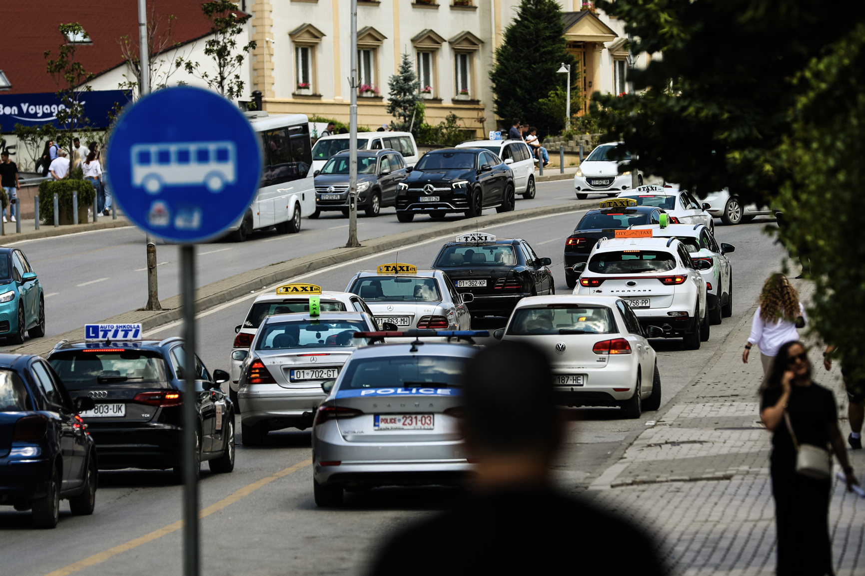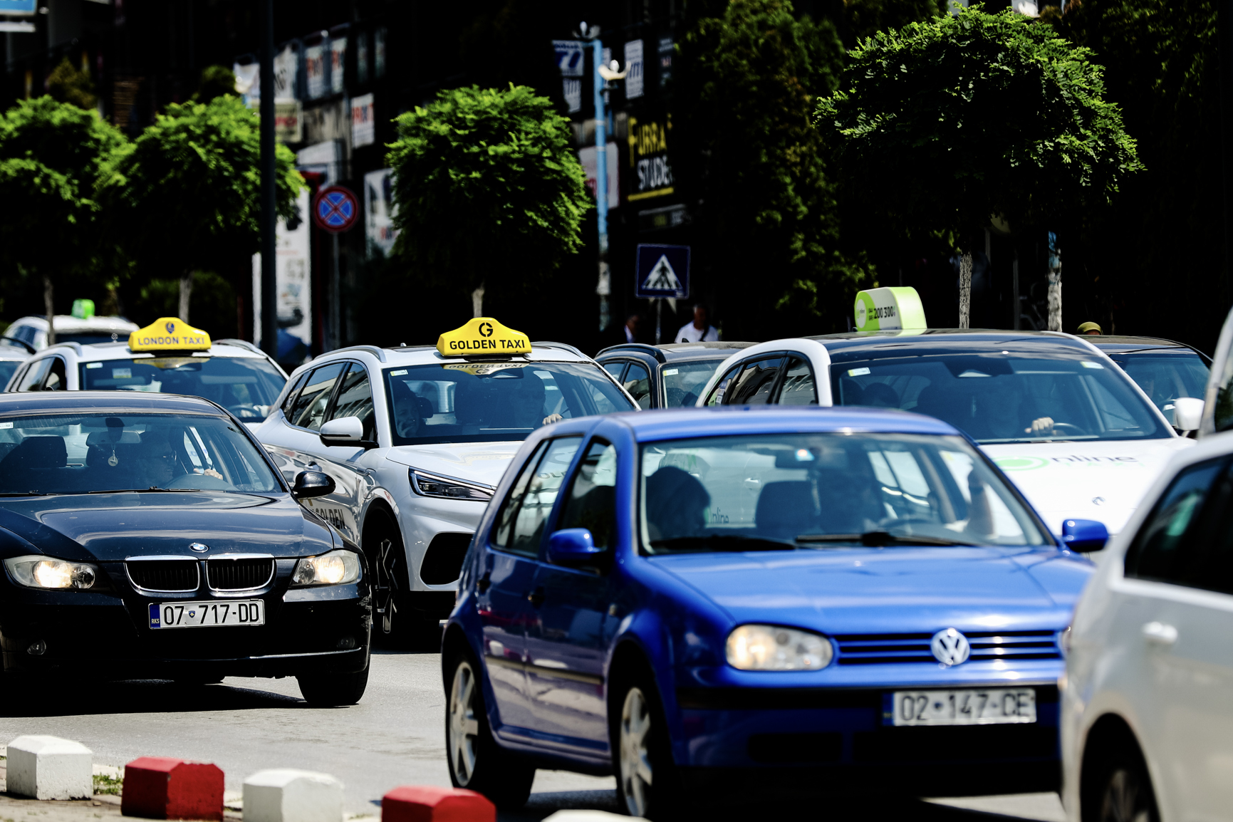 Ndërsa disa burra tjerë, të ulur në vetura, a të mbështetur për to, presin për punë. Ata janë punëtorë të kompanive private të taksive në Prishtinë.