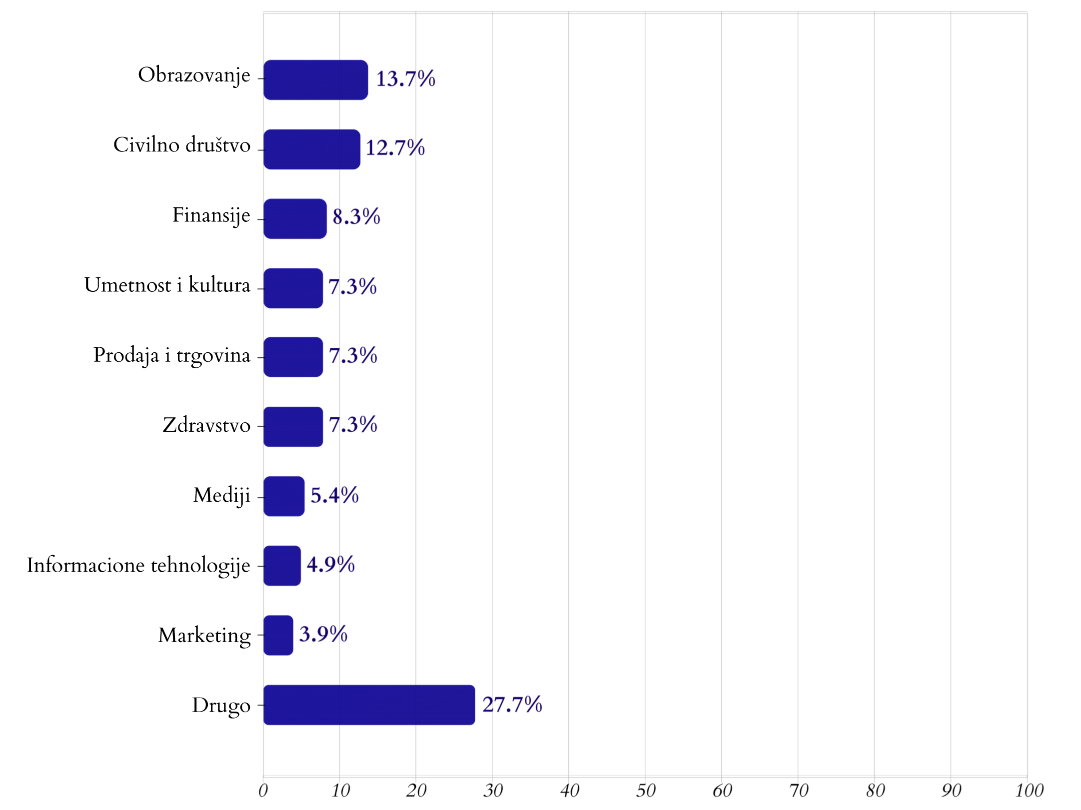 Pošto je upitnik bio namenjen korisnicima/ama koji/e koriste veštačku inteligenciju na poslu, ovi podaci pokazuju da se AI proširila kroz različite industrije.