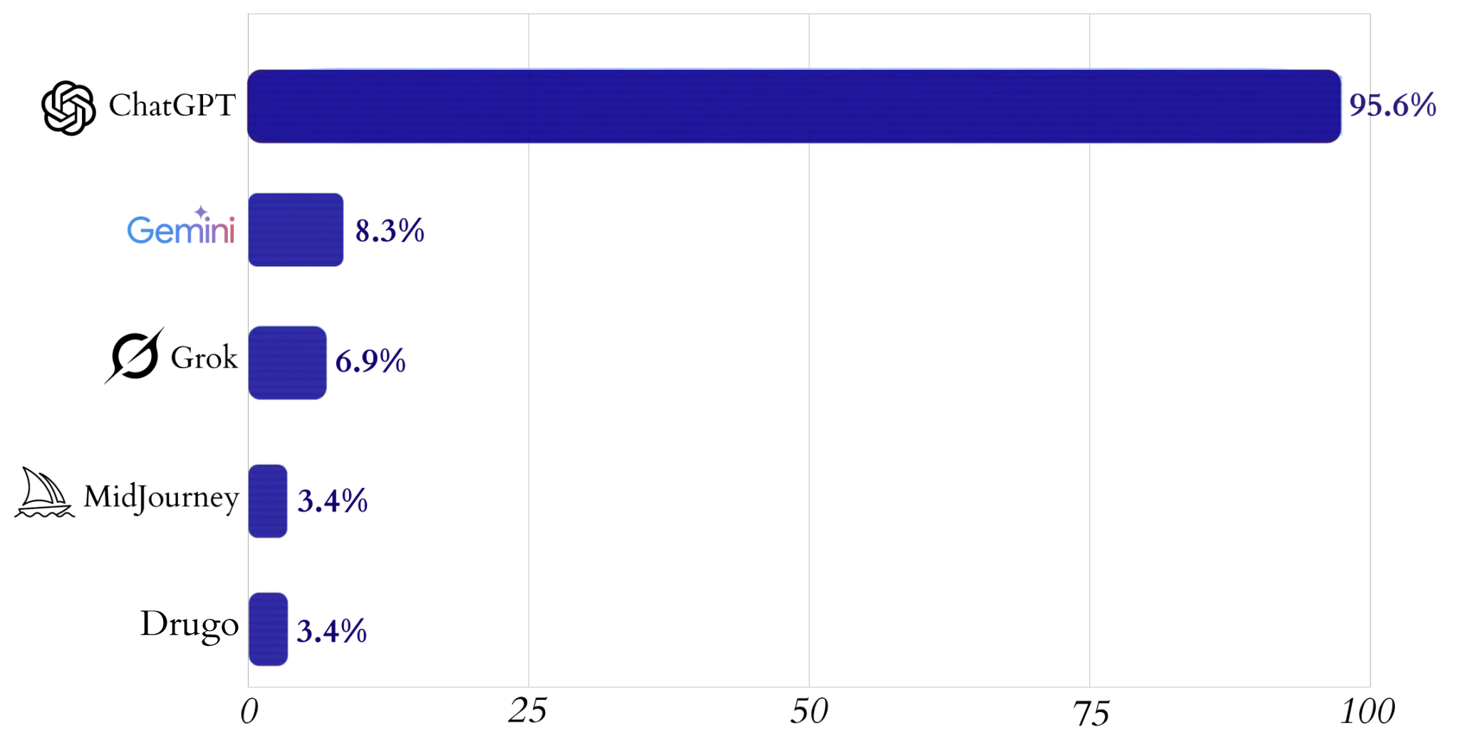 Ubedljiva većina anketiranih, odnosno 95,6%, koristi ChatGPT, dok 8,3% koristi Gemini, 6,9% Grok, kao i niz drugih aplikacija — ispitanici/e su mogli/e da izaberu više od jedne opcije. Ovakva visoka stopa korišćenja ChatGPT-a može se objasniti njegovom lakom integracijom i dostupnošću u besplatnim verzijama. Isti trend prisutan je i na globalnom nivou. Podaci pokazuju da je do februara 2025. ChatGPT imao gotovo 400 miliona aktivnih nedeljnih korisnika i oko 122,58 miliona dnevnih korisnika.