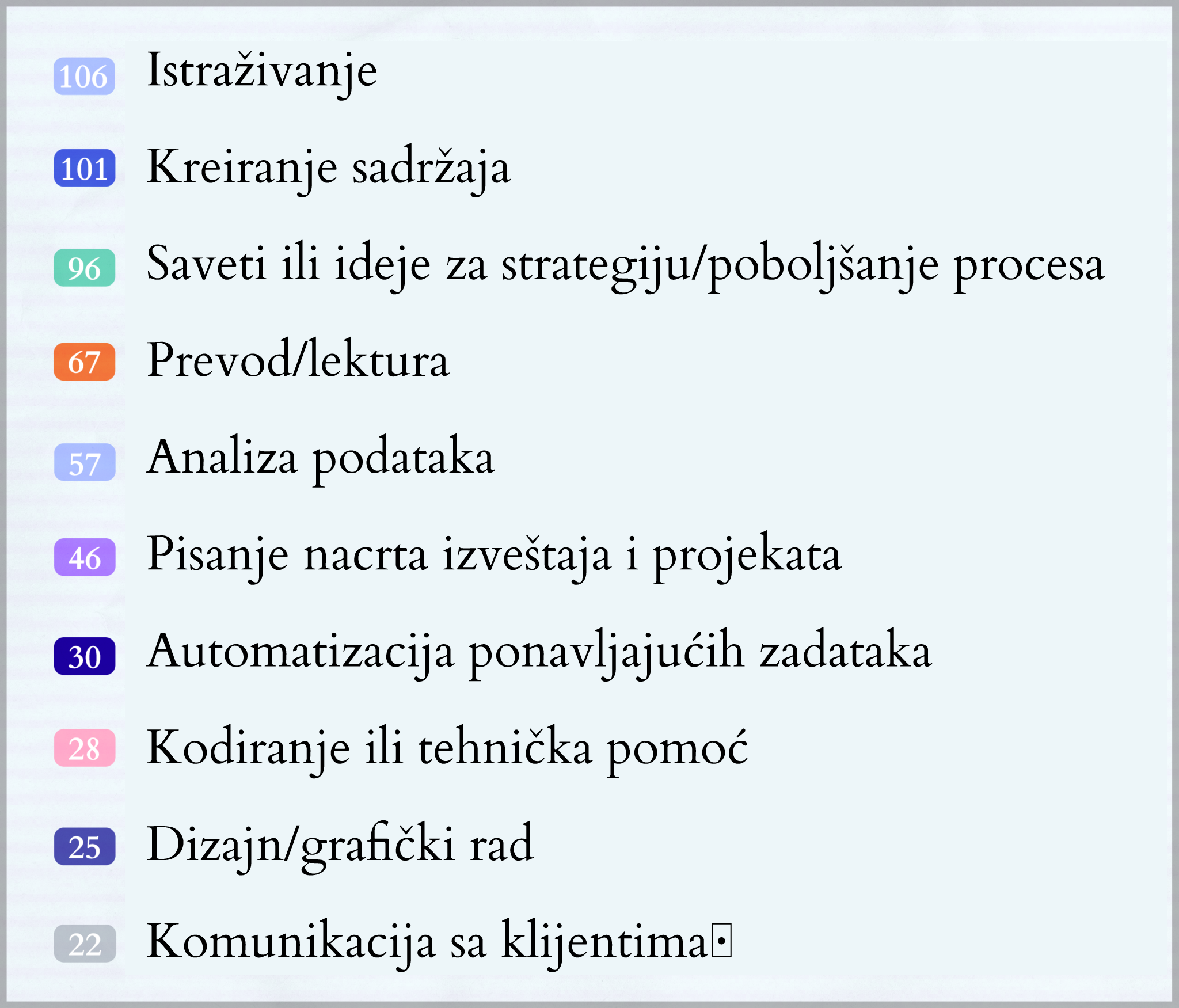 Ispitanici/e su naveli/e da GenAI najviše koriste za istraživanje i kreiranje sadržaja, kao što su: tekstovi, članci, opisi i objave na društvenim mrežama.