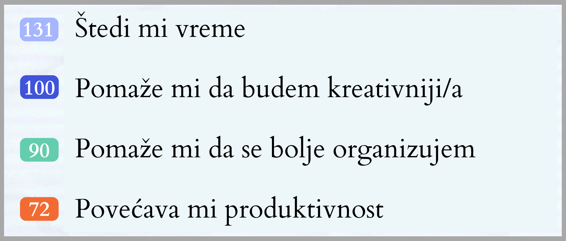 Prema ispitanicima/ama, četiri glavne prednosti korišćenja GenAI na poslu su: ušteda vremena, podsticaj kreativnosti, bolja organizacija i veća produktivnost.