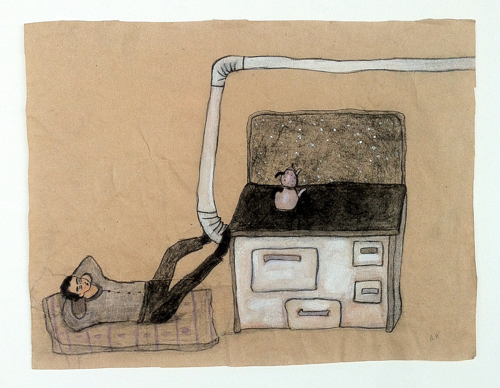 Osim forme, čak su i sadržaj vaših crteža te izražaj zastupljen u njima manje-više minimalistički. Naime, svi likovi su okupljeni oko peći, suši se kosa, cijela porodica boravi u jednoj sobi, a tu su i još neki slični detalji. Šta je odredilo te različite elemente?