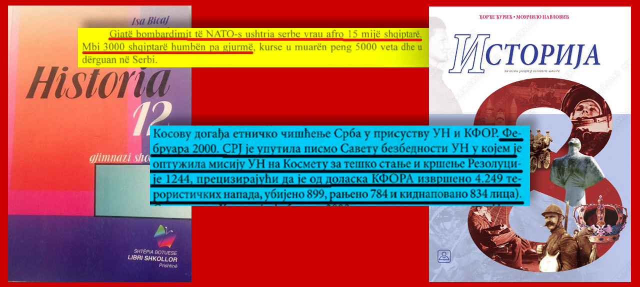 Srbi/kinje na sjeveru Kosova služe se udžbenicima te nastavnim planovima i programima iz Beograda koji negiraju ratne zločine izvršene na Kosovu. U samo nekoliko paragrafa koliko ih se bavi ratom na Kosovu spominje se takozvana “agresija NATO-a” uz tvrdnju da je u NATO-ovom bombardovanju poginulo između 1200 i 2500 osoba, s tim da se žrtve srpskih snaga ni ne spominju.