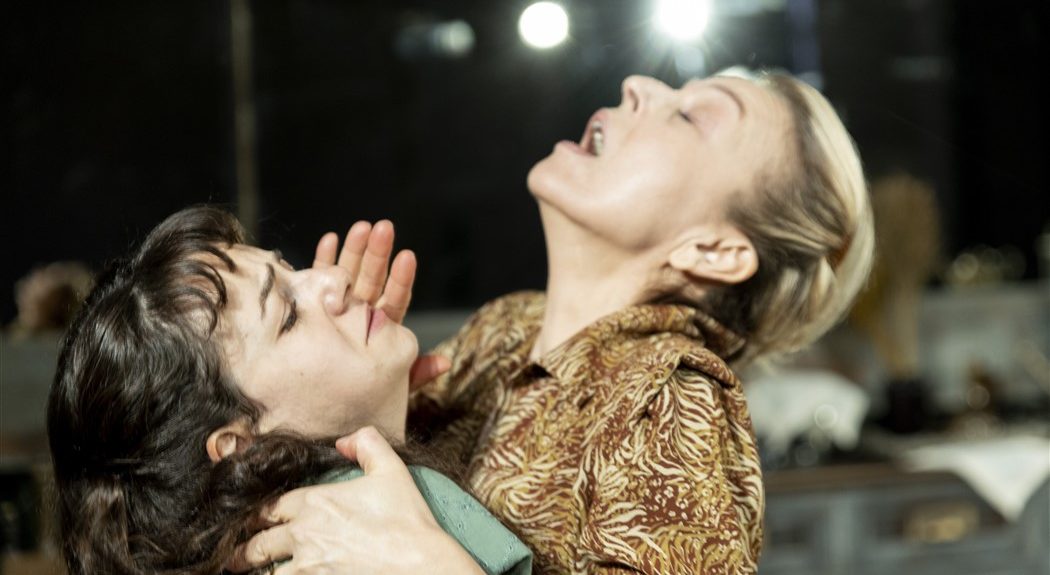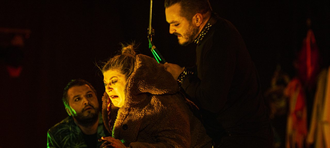 Pogled iz predstave "Stiffler", prvi put postavljene 4. decembra 2021. u pozorištu “ODA” u Prištini. Autorka: Doruntina Baša, reditelj: Kuštrim Kolići. Rebeka Ćena u ulozi Have, u različitim glavnim ulogama: Adrian Morina i Armend Smajli.