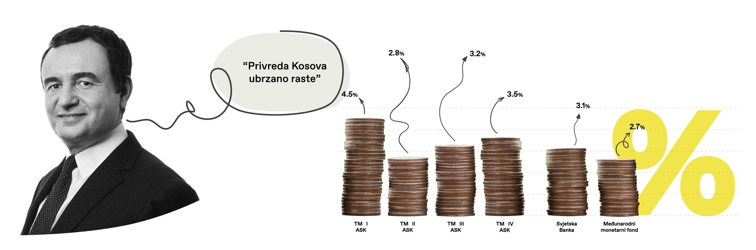 Premijer je tokom 2022. godine kao uspjehe često isticao privredni rast od 10,7%, koji je zabilježen 2021. godine, te od 4% zabilježen 2022. Međutim, podaci Svjetske banke, Međunarodnog monetarnog fonda i Centralne banke Kosova ukazuju na to da je privredni rast 2022. godine stao.
