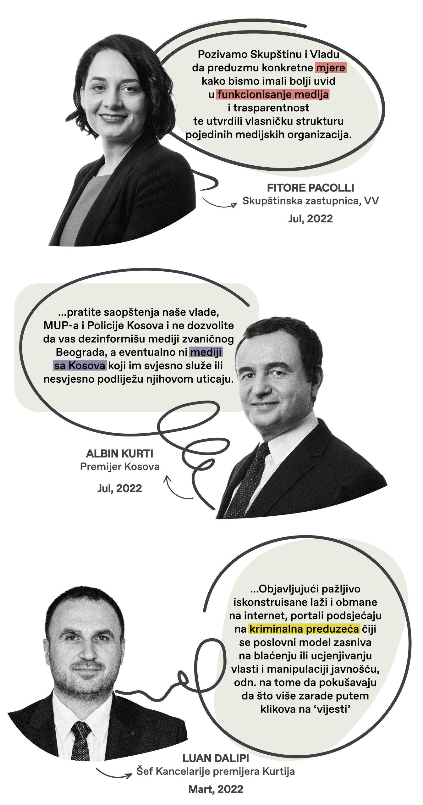 Predstavnici_e kosovskih medija su kao jednu od zabrinjavajućih okolnosti apostrofirali činjenicu da retorika podjela i kampanje blaćenja koje pojedini političari_ke državni funkcioneri_ke — uključujući i one iz redova vladajuće stranke — vode protiv novinara_ki doprinose stvaranju sve veće netrpeljivosti spram medija. Kako navode predstavnici_e medija, ti verbalni napadi te pokušaji ličnosti sa političke scene da unesu razdor u novinarsku zajednicu i da neke medijske organizacije predstave kao političke igrače mogu imati za posljedicu prijetnje, uznemiravanje i fizičko nasilje.