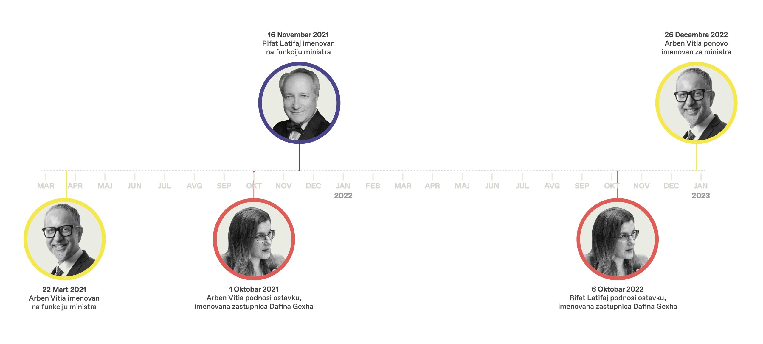 Imenovan za ministra zdravstva u novembru 2021, Rifat Latifi je u oktobru 2022. podnio ostavku. Funkcija je ostala upražnjena gotovo dva mjeseca, odn. sve dok je Vlada ponovo nije dodijelila Arbenu Vitiji, koji je u oktobru 2021. podnio ostavku na ministarsku dužnost jer se kandidovao za gradonačelnika Prištine.