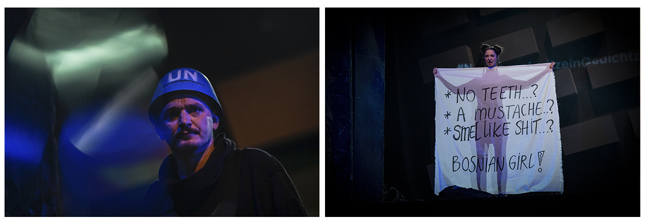 “Iako obe strane deluju isto… budite oprezni… na drugoj strani, užas, orijentalistički despotizam, žene su žrtve nasilja, silovanja i to im se sviđa… sa evropske strane, civilizacija, žene su žrtve nasilja i silovanja, ali im se to ne sviđa”, kaže lik koji glumi Žižeka u predstavi.