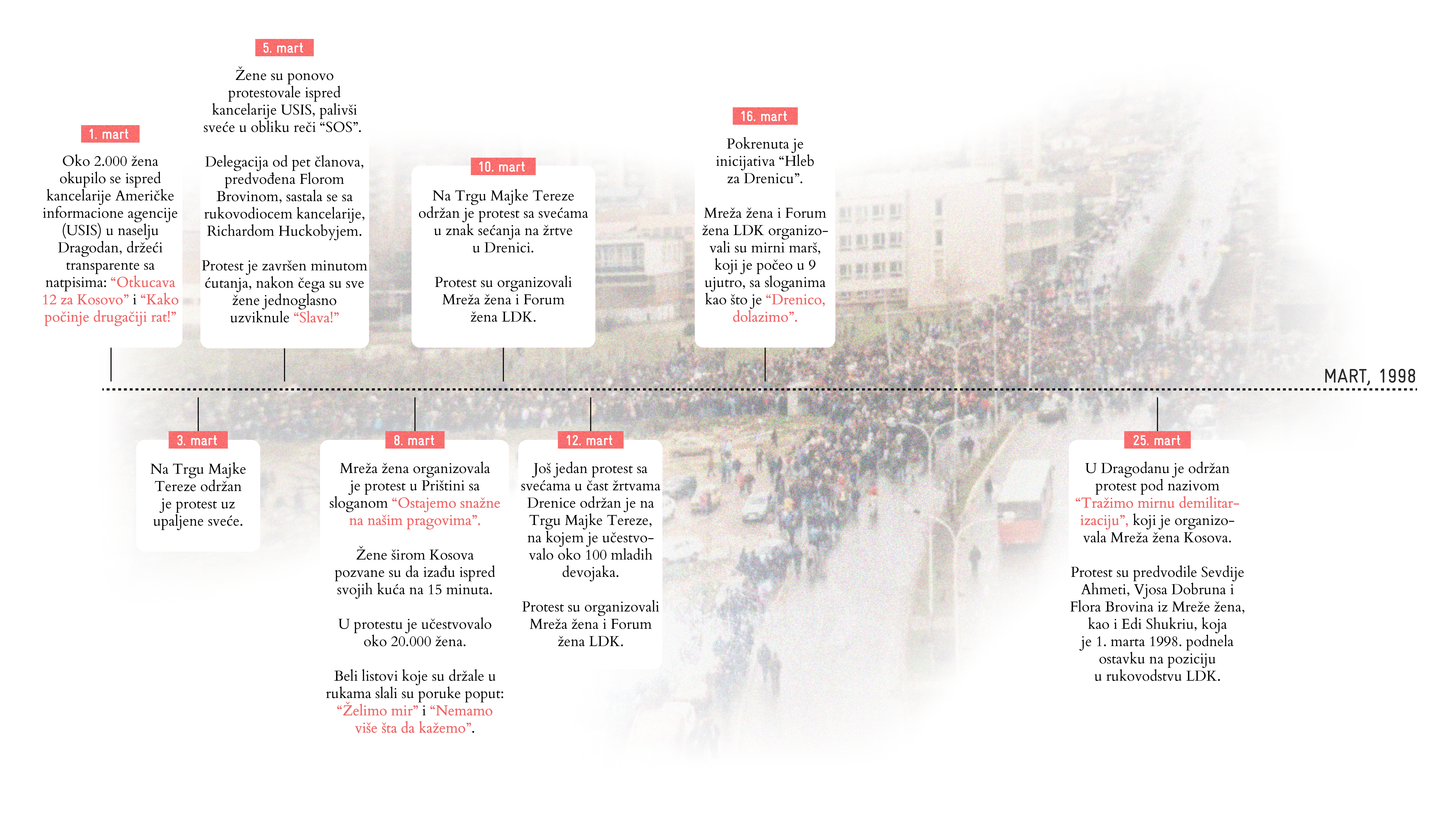 U duhu mirnih protesta, aktivistkinje su bile među prvima koje su reagovale na eskalaciju nasilja nakon masakra porodica Ahmeti i Jashari u februaru i martu 1998. godine. Zaštita porodica, žena i dece, kao i javna mobilizacija u njihovu podršku, pomogle su u prevazilaženju razlika između pristupa žena iz Ženskog foruma LDK-a i onih iz civilnog društva. Žene su se okupile pod nazivom Mreža žena Kosova i započele zajednički javni angažman. Mart 1998. godine postao je mesec kada je ženski pokret postao vidljiviji i aktivniji u javnosti kroz proteste.