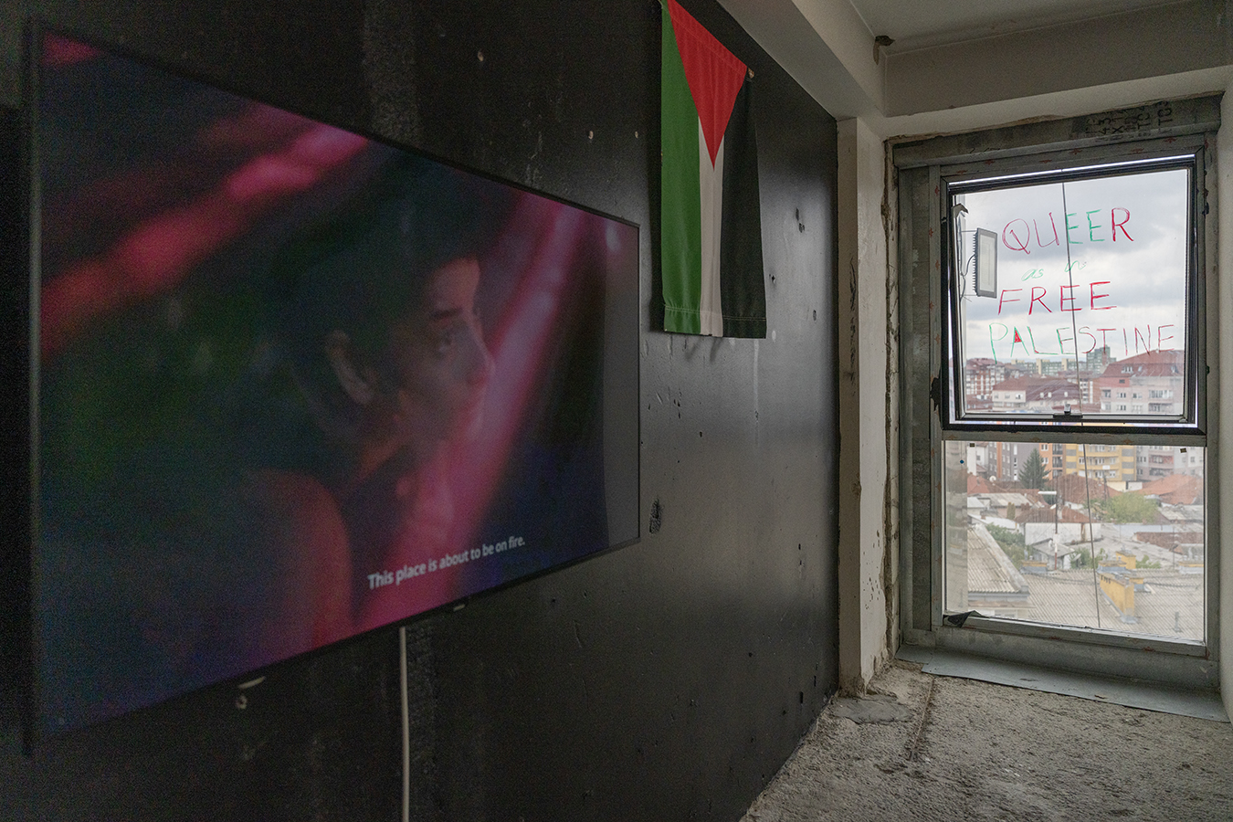Čim čujete magnetičnu dance-pop pesmu kako dopire iz jedne od soba sivog Grand hotela u Prištini, nemoguće je odoleti da ne zavirite unutra. Pesma “Intifada on the Dance Floor” palestinskog umetnika Bashara Murada kombinuje house ritmove sa arapskim instrumentima i, kao većina njegovih radova, bavi se nasiljem svakodnevnog života Palestinaca/ki, izraelskom okupacijom i svakodnevnim radostima palestinskog naroda.