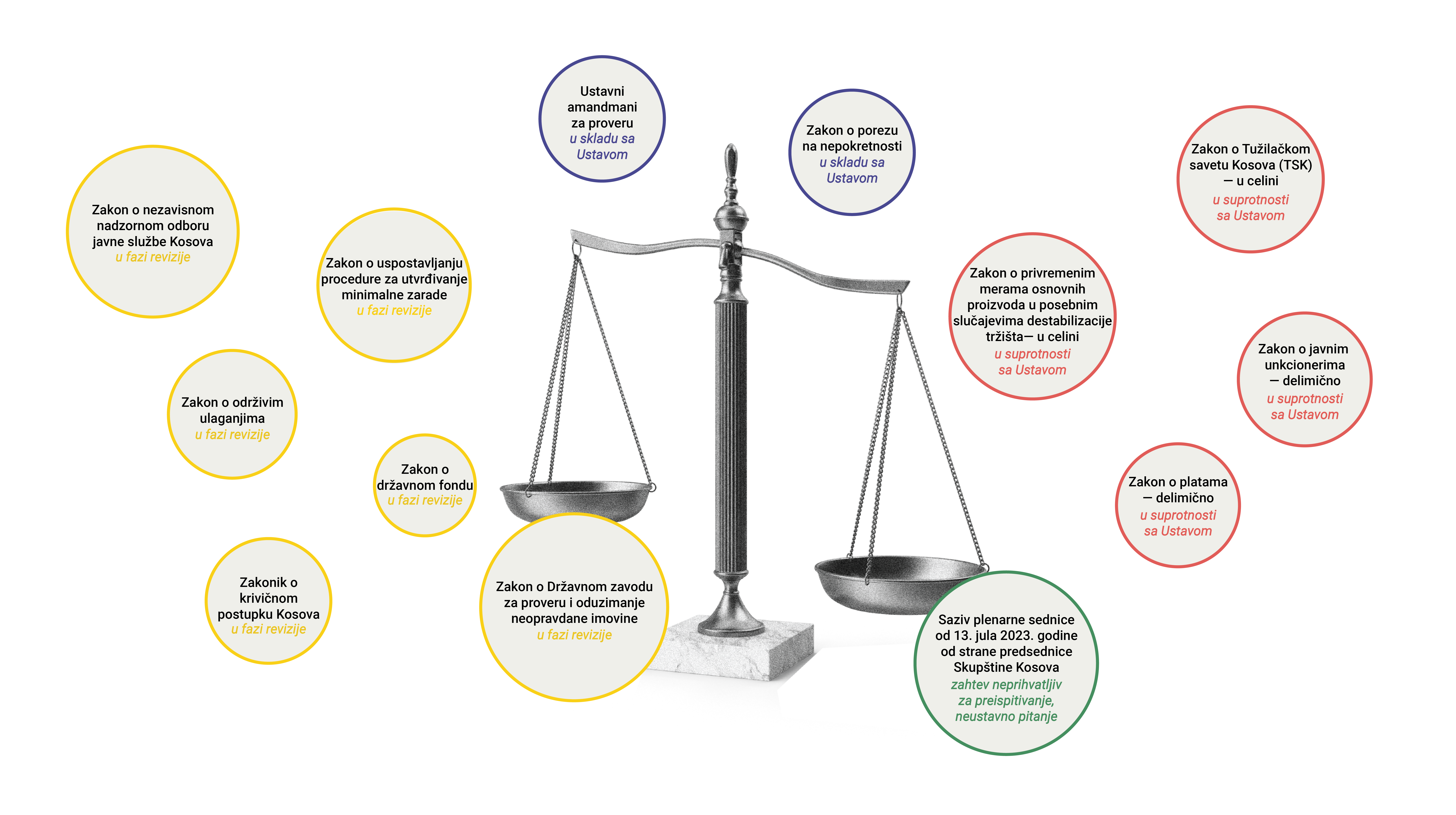 Prema izveštaju Kosovskog instituta za pravo (IKD), od 26 predmeta koji se odnose na vladine i parlamentarne odluke koje je Ustavni sud proglasio neustavnim tokom svog postojanja, 10 predmeta ili 36% pripada aktuelnoj vladi, odnosno aktuelnom zakonodavnom telu.