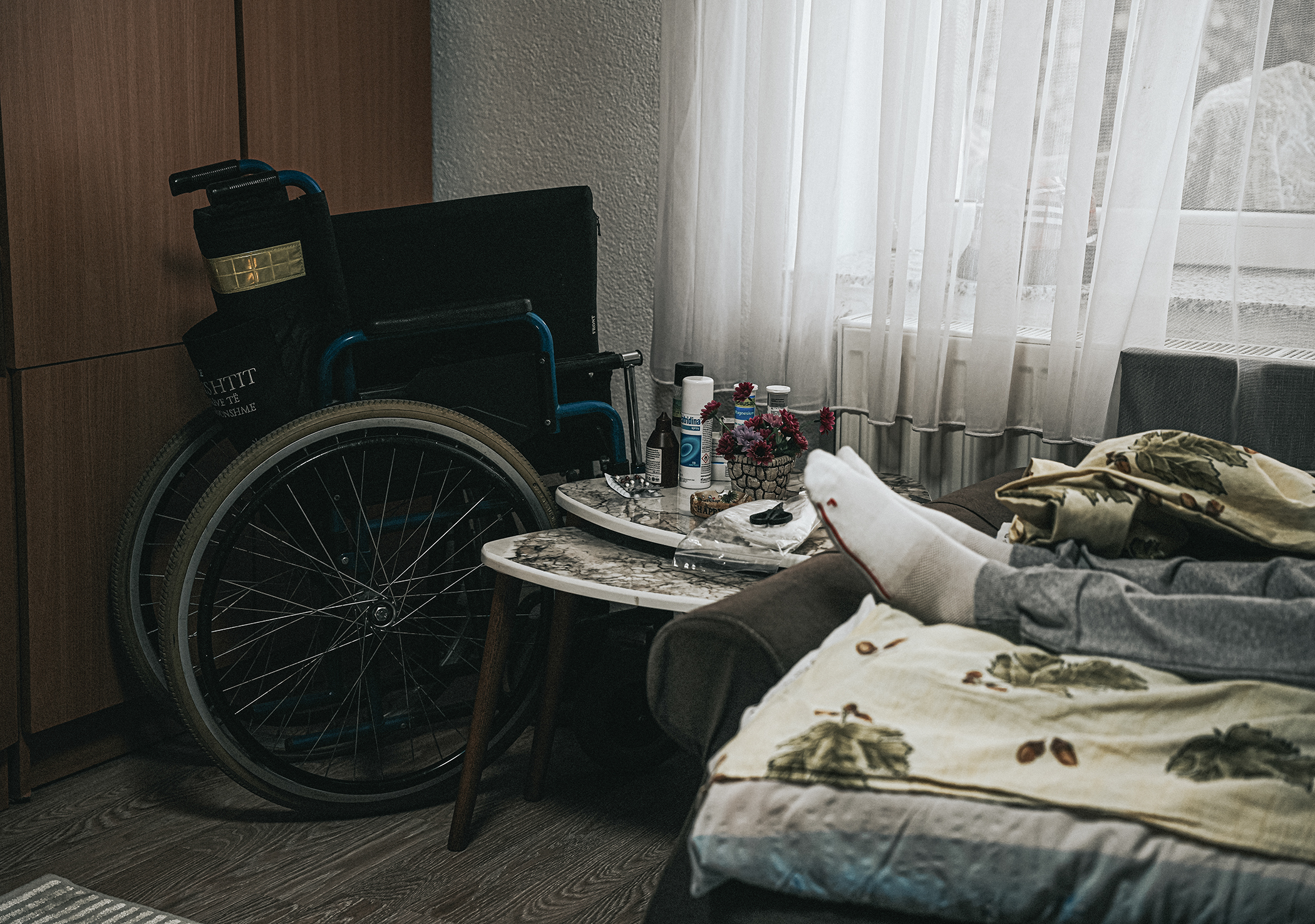 “Për një femër shumë e vështirë, vetë gru – vetë burrë, a po vdes qitash, a po vdes qitash”, thotë Salihja teksa fërkon me dy duart këmbët e mpira e të rënduara të Pajazitit. “Në banjo kur e shti e laj me [aparat] të oksigjenit, dridhna kur i bjen niveli i oksigjenit në 60”.