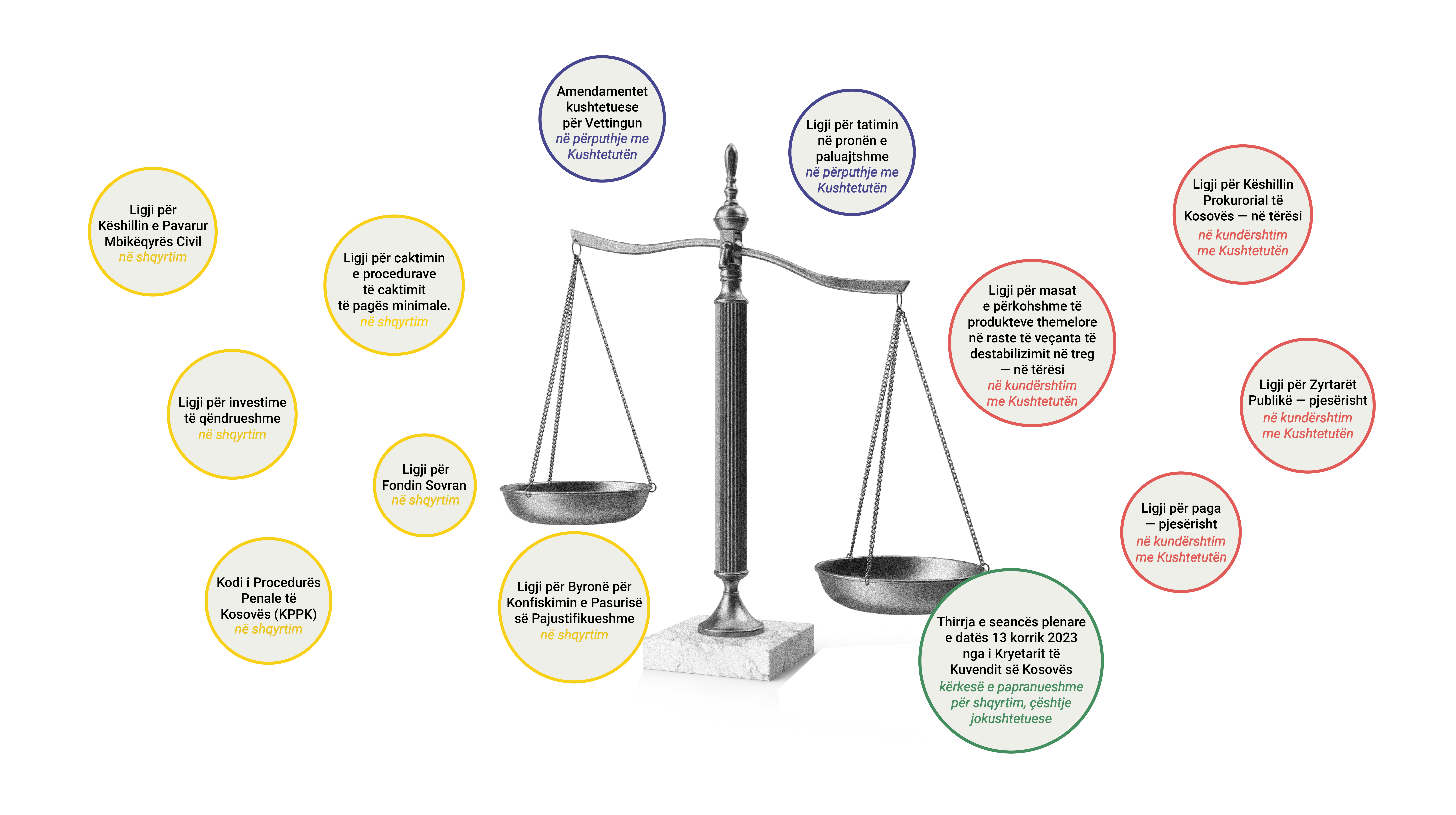 Gjykata Kushtuetuese e Kosovës ka qenë më e zënë se zakonisht gjatë qeverisë Kurti. Partitë opozitare, Partia Demokratike e Kosovës (PDK), Lidhja Demokratike e Kosovës (LDK) dhe Aleanca për Ardhmërinë e Kosovës (AAK), i kanë dërguar disa ligje të iniciuara nga qeveria e të miratuara në Kuvend te kjo gjykatë për ta vlerësuar kushtetutshmërinë e tyre.