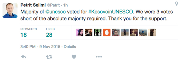 Zëvendës ministri i punëve të jashtme, Petrit Selimi, që ka qenë në frontin e përpjekjeve diplomatike për fushatën “Kosova në UNESCO” njëlloj u përpoq të nxjerr anët pozitive, duke shkruar në Twitter se Kosova kishte fituar shumicën e votave të anëtarëve të UNESCO.
